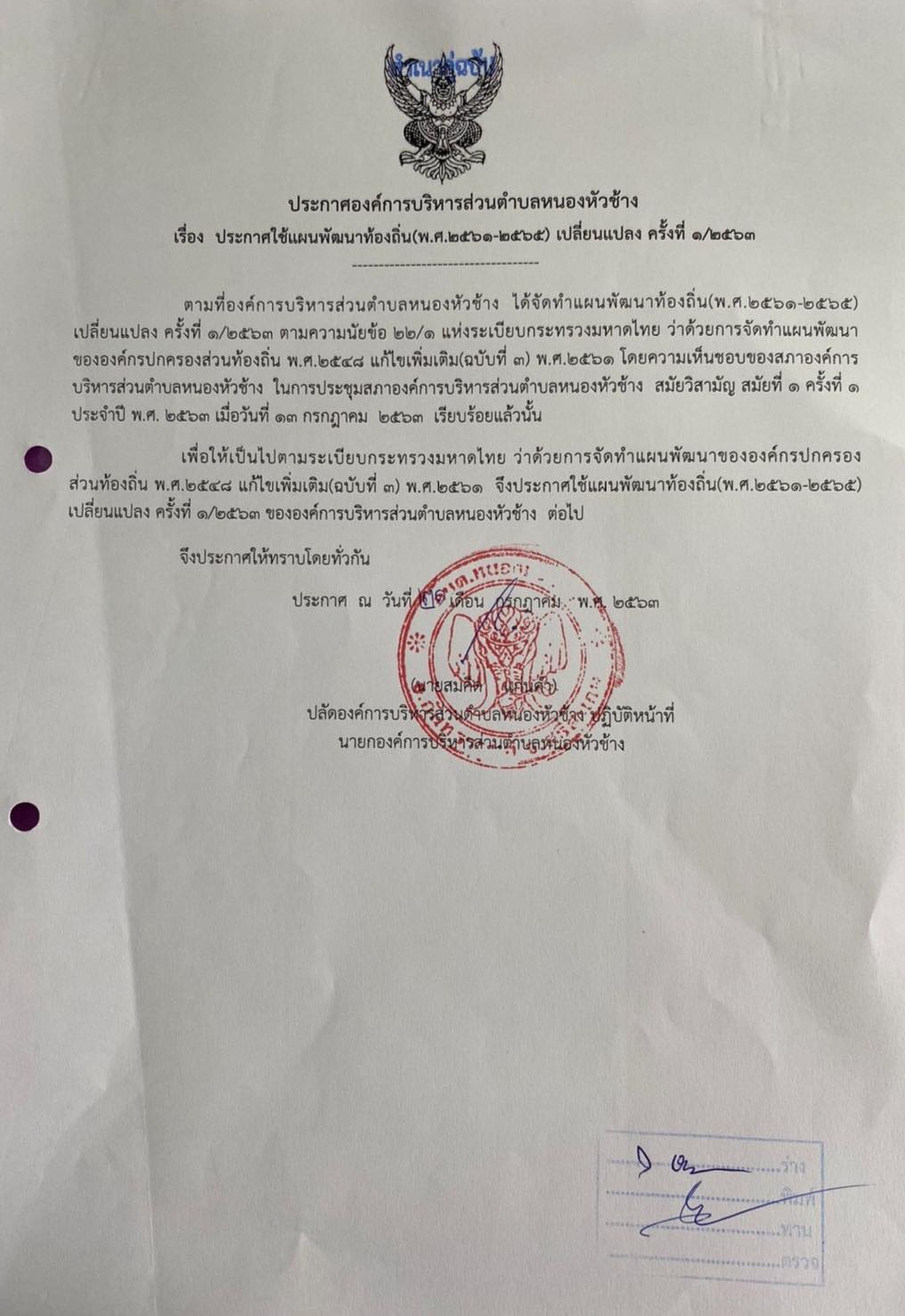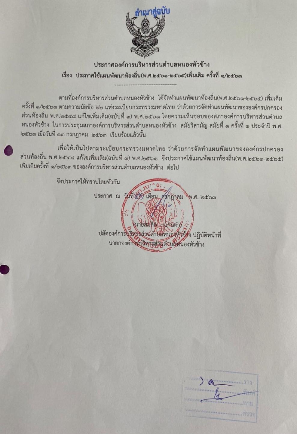 วันอังคาร, 21 กรกฎาคม 2563 15:38แผนพัฒนาท้องถิ่น (พ.ศ.2561-2565) เปลี่ยนแปลง ครั้งที่ 1/2563 องค์การบริหารส่วนตำบลหนองหัวช้าง อำเภอกันทรารมย์ จังหวัดศรีสะเกษ