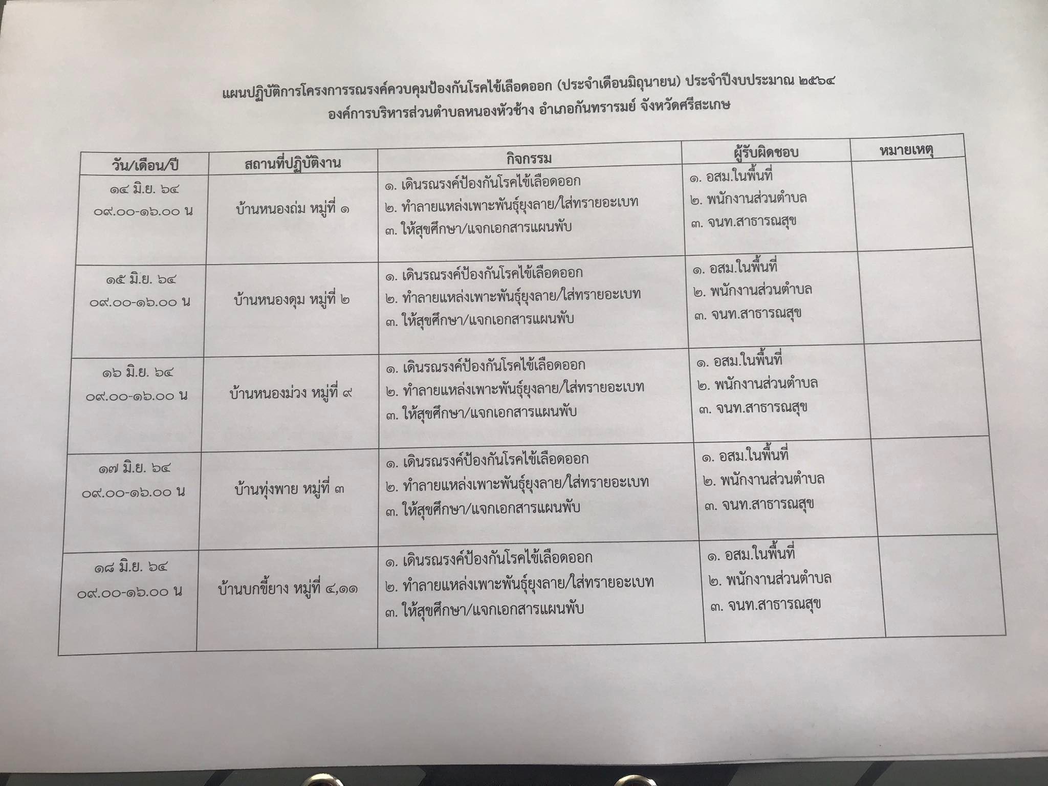 วันจันทร์, 14 มิถุนายน 2564 14:10วันที่ 14 มิถุนายน 2564 เวลา 09.00 น. นายสมคิด แก่นคำ ปลัดองค์การบริหารส่วนตำบลหนองหัวช้าง ปฏิบัติหน้าที่นายกองค์การบริหารส่วนตำบลหนองหัวช้าง ได้จัดทำโครงการรณรงค์ควบป้องกันโรคไข้เลือดออก(ตามแผนปฏิบัติการรณรงค์โครงการฯประจำเดือนมิถุนายน) ประจำปีงบประมาณ พ.ศ.2564 ตำบลหนองหัวช้าง อำเภอกันทรารมย์ จังหวัดศรีสะเกษ