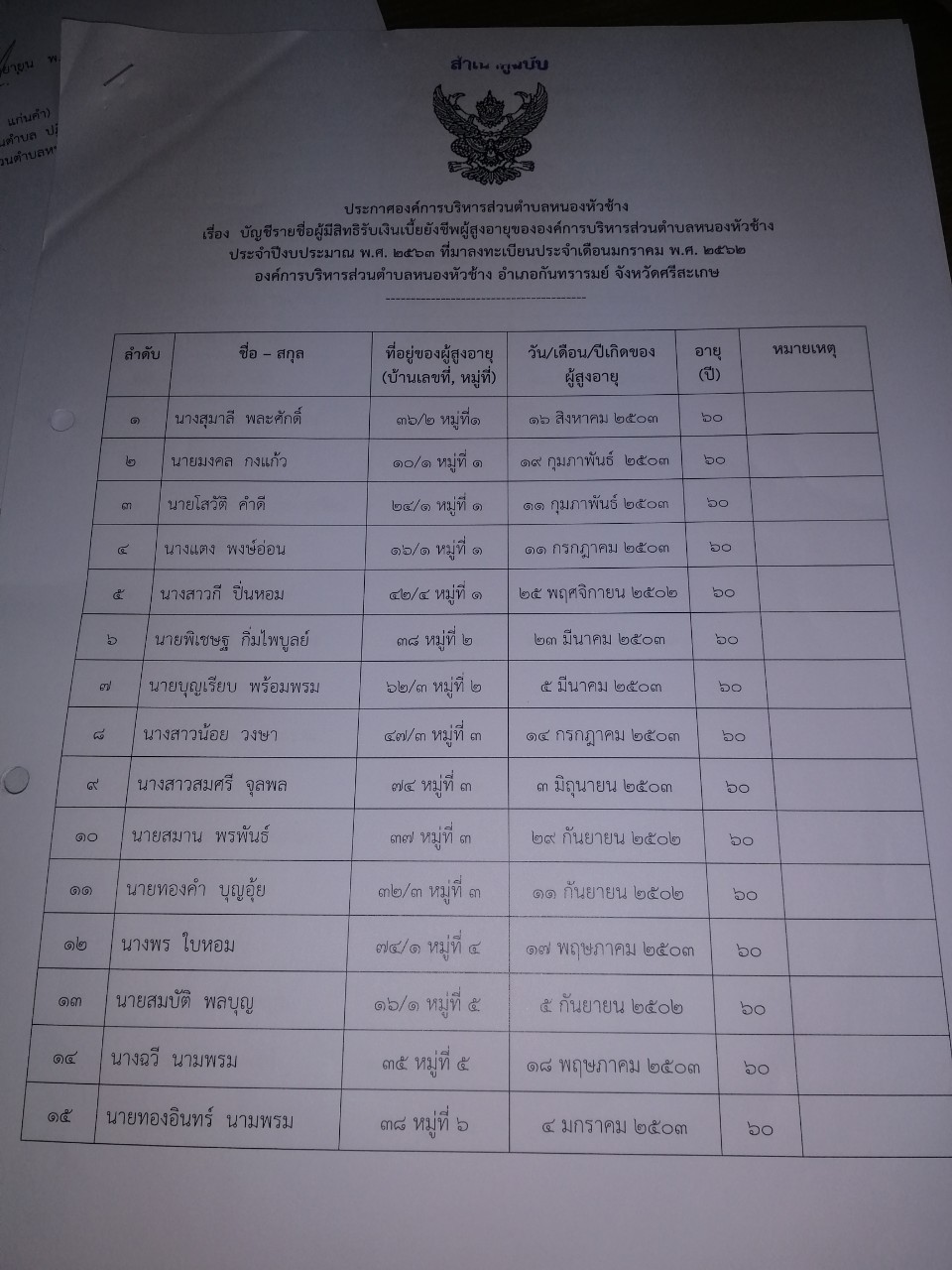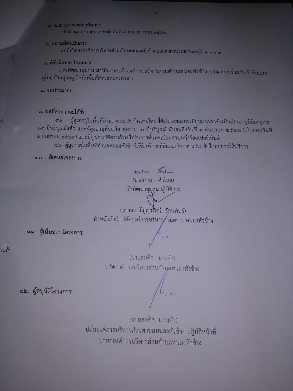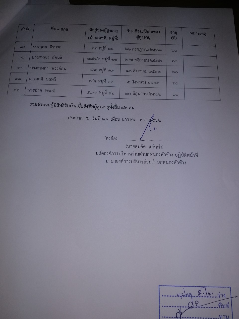 องค์การบริหารส่วนตำบลหนองหัวช้าง ได้จัดทำโครงการออกให้บริการรับลงทะเบียนผู้มีสิทธิรับเงินเบี้ยยังชีพผู้สูงอายุ ประจำปีงบประมาณ พ.ศ.2562 เพื่อรับเบี้ยยังชีพผู้สูงอายุ ประจำปีงบประมาณ พ.ศ. 2563