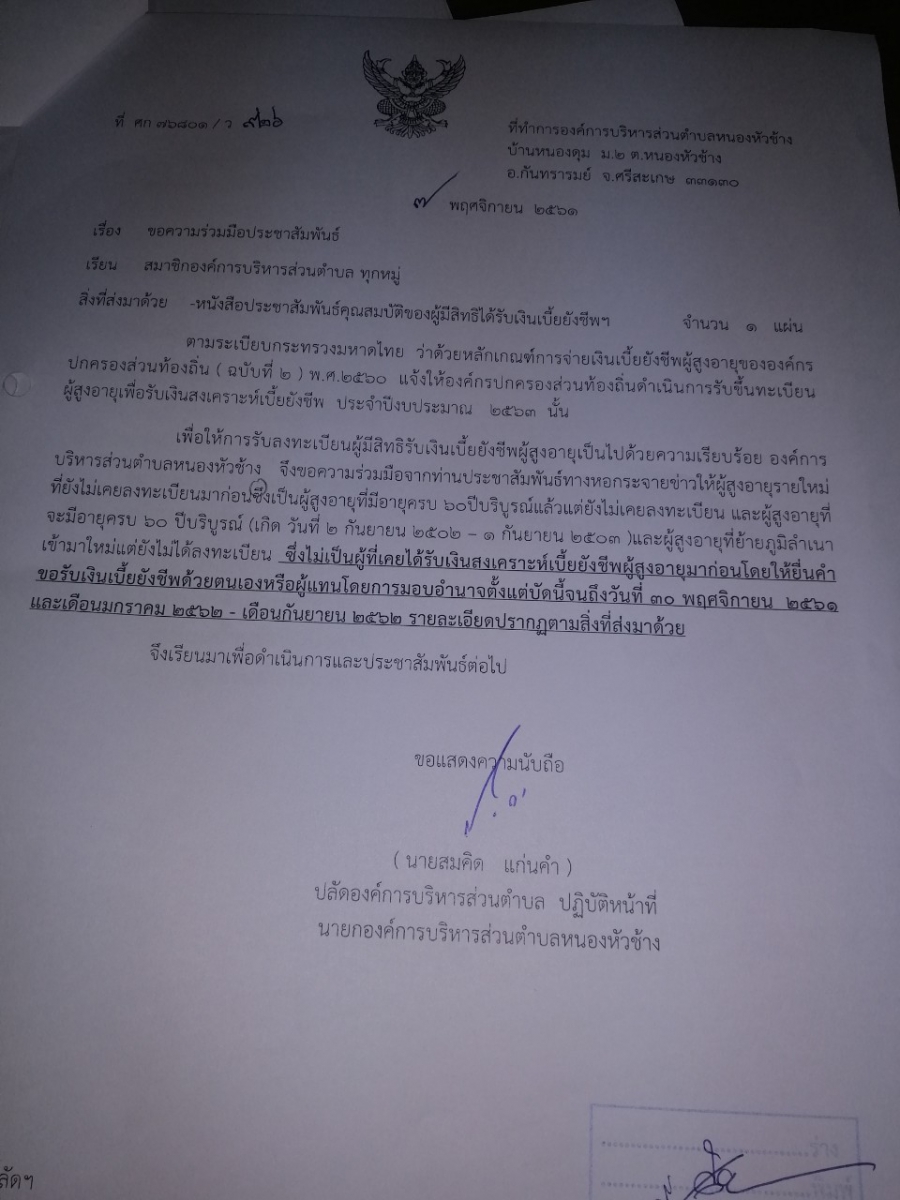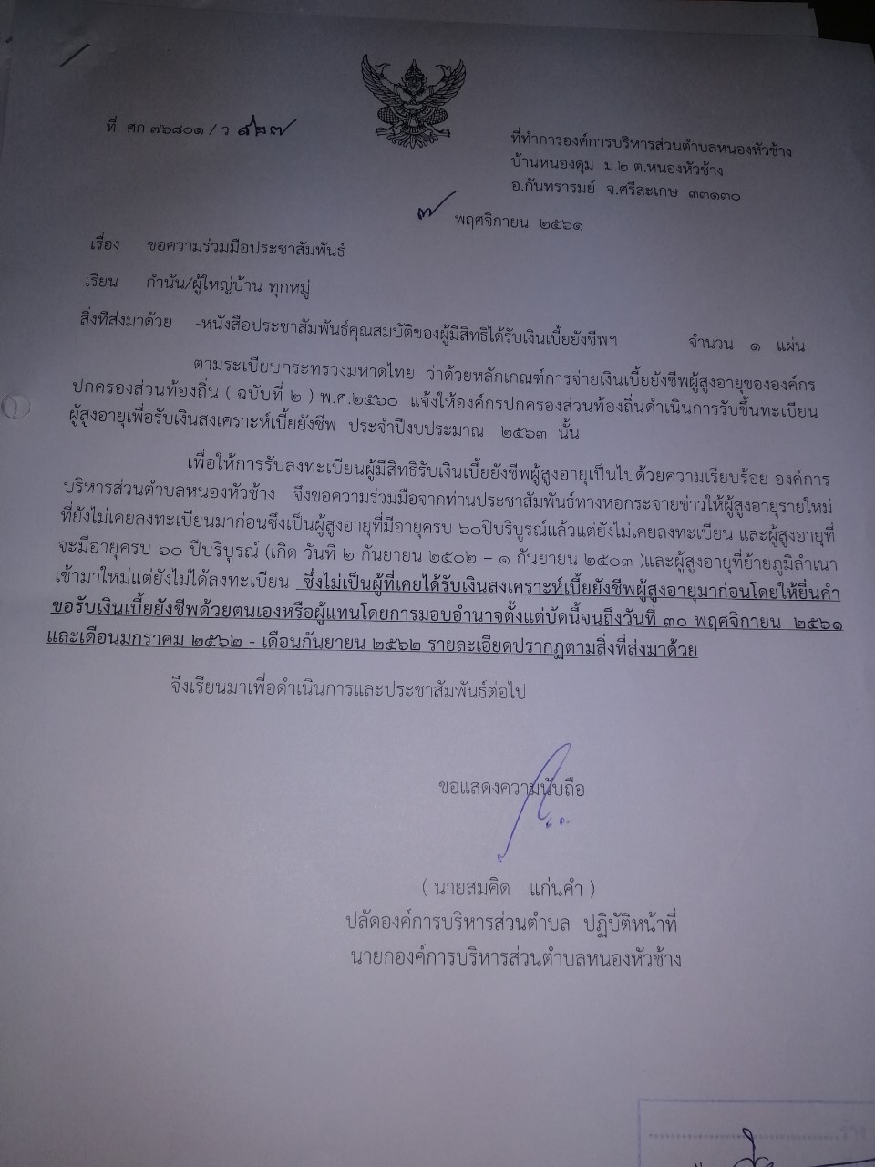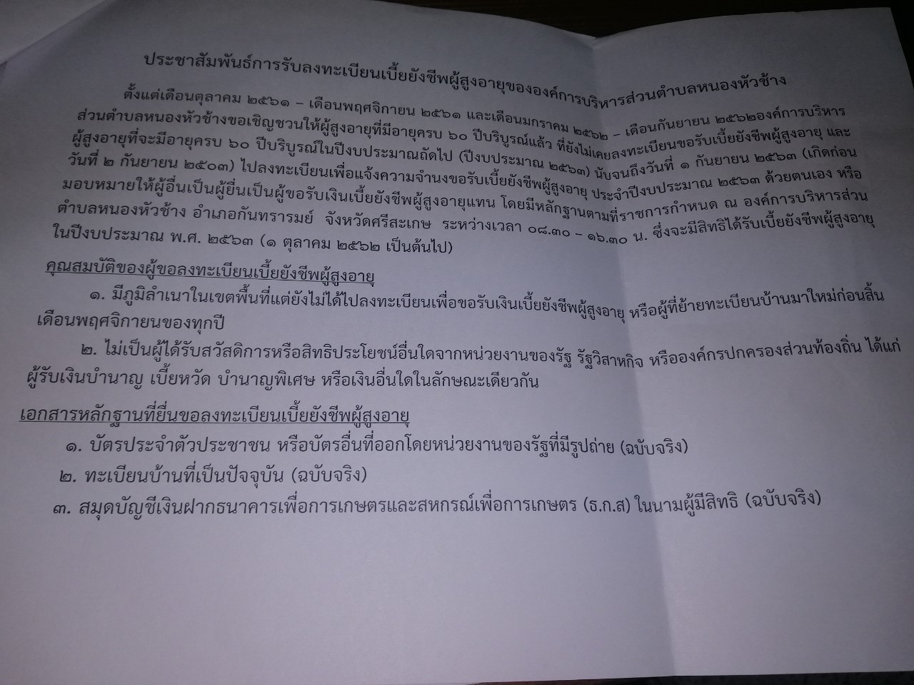 องค์การบริหารส่วนตำบลหนองหัวช้าง ได้จัดทำโครงการออกให้บริการรับลงทะเบียนผู้มีสิทธิรับเงินเบี้ยยังชีพผู้สูงอายุ ประจำปีงบประมาณ พ.ศ.2562 เพื่อรับเบี้ยยังชีพผู้สูงอายุ ประจำปีงบประมาณ พ.ศ. 2563