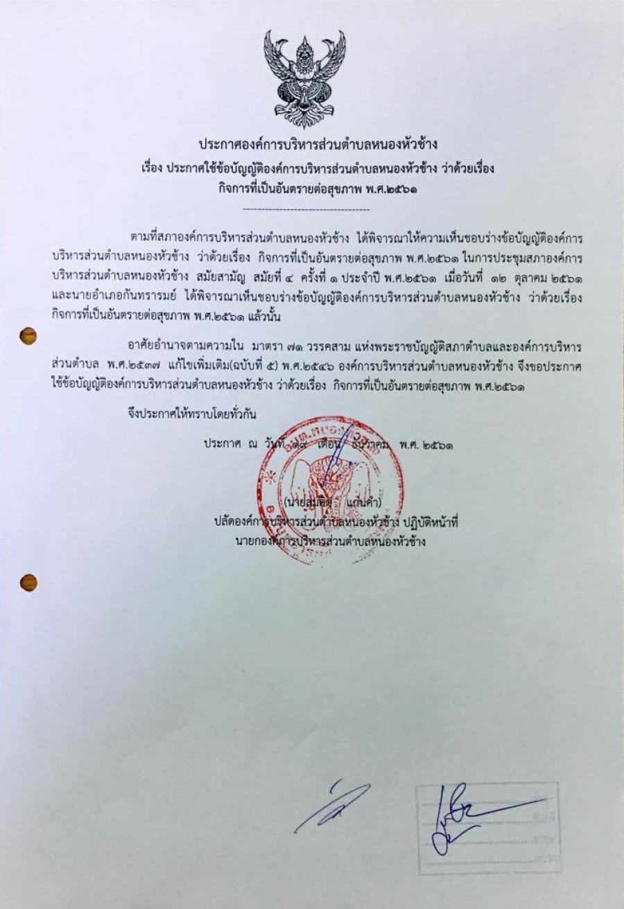 ประกาศองค์การบริหารส่วนตำบลหนองหัวช้าง เรื่อง ประกาศใช้ข้อบัญญัติองค์การบริหารส่วนตำบลหนองหัวช้าง ว่าด้วยเรื่อง กิจการที่เป็นอันตรายต่อสุขภาพ พ.ศ. 2561