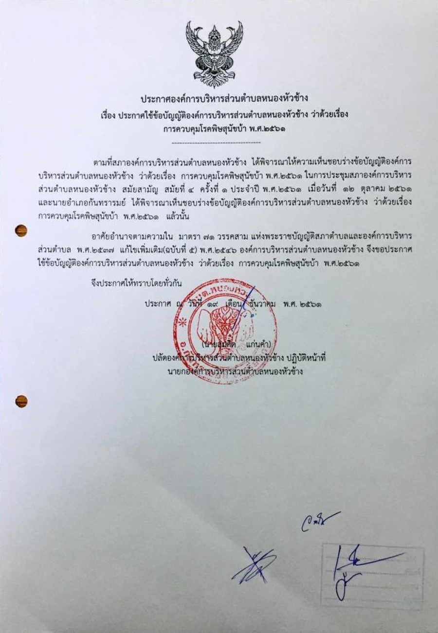 ประกาศองค์การบริหารส่วนตำบลหนองหัวช้าง เรื่อง ประกาศใช้ข้อบัญญัติองค์การบริหารส่วนตำบลหนองหัวช้าง ว่าด้วยเรื่อง การควบคุมโรคพิษสุนัขบ้า พ.ศ. 2561