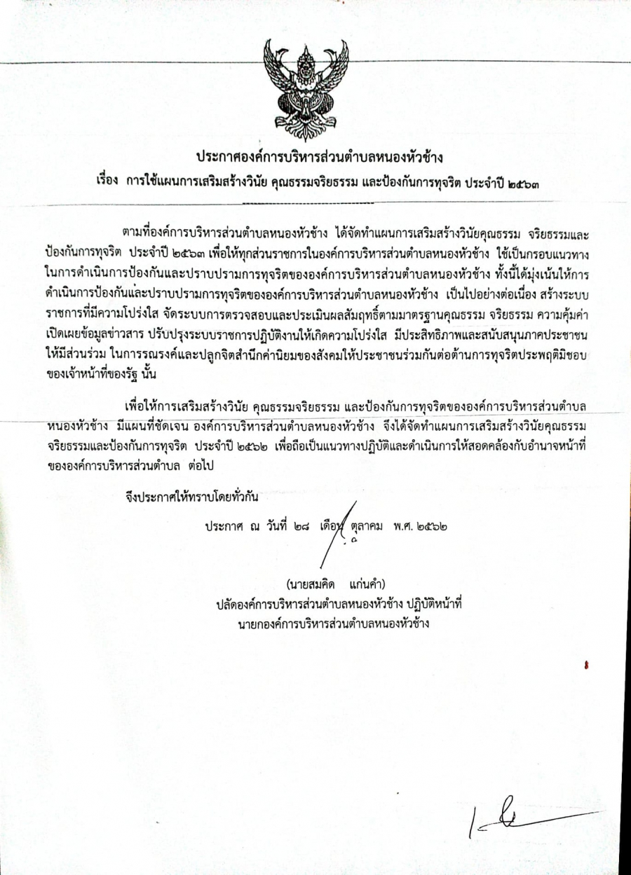 ประกาศองค์การบริหารส่วนตำบลหนองหัวช้าง เรื่อง การใช้แผนการเสริมสร้างวินัย คุณธรรมจริยธรรม และป้องกันการทุจริต ประจำปี 2563