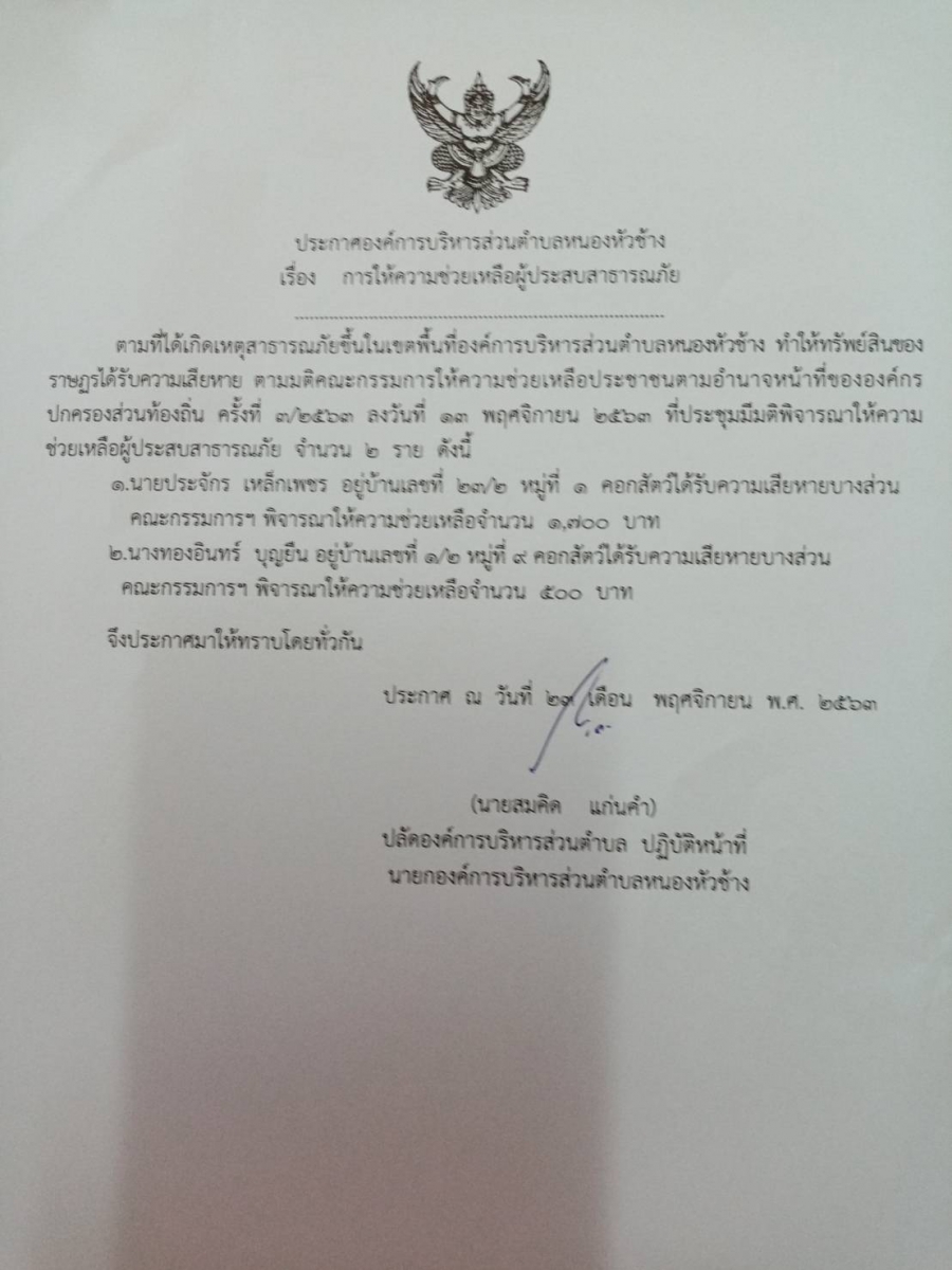 ประกาศองค์การบริหารส่วนตำบลหนองหัวช้าง เรื่อง การให้ความช่วยเหลือผู้ประสบสาธารณภัย พ.ศ. 2563 วันพุธ, 09 ธันวาคม 2563 14:32 Print Email ประกาศองค์การบริหารส่วนตำบลหนองหัวช้าง เรื่อง การให้ความช่วยเหลือผู้ประสบสาธารณภัย พ.ศ. 2563 ดาวน์โหลดเอกสาร (4207 Downloads) back to top
