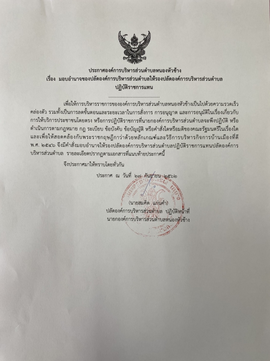 ประกาศองค์การบริหารส่วนตำบลหนองหัวช้าง เรื่อง มอบอำนาจของปลัดองค์การบริหารส่วนตำบลให้รองปลัดองค์การบริหารส่วนตำบลปฏิบัติราชการแทน