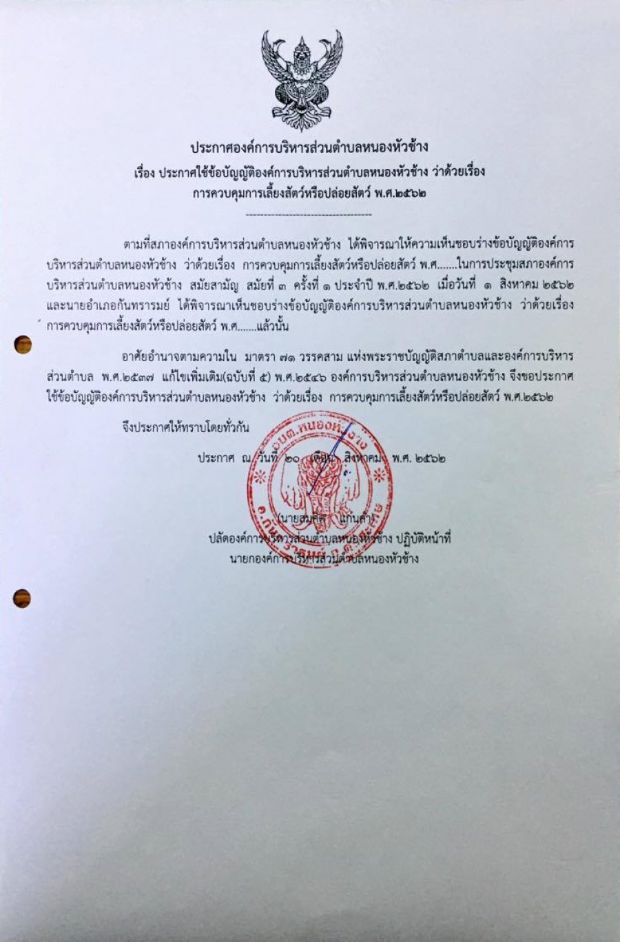 ประกาศองค์การบริหารส่วนตำบลหนองหัวช้าง เรื่อง ประกาศใช้ข้อบัญญัติองค์การบริหารส่วนตำบลหนองหัวช้าง ว่าด้วยเรื่อง การควบคุมการเลี้ยงสัตว์หรือปล่อยสัตว์ พ.ศ. 2562