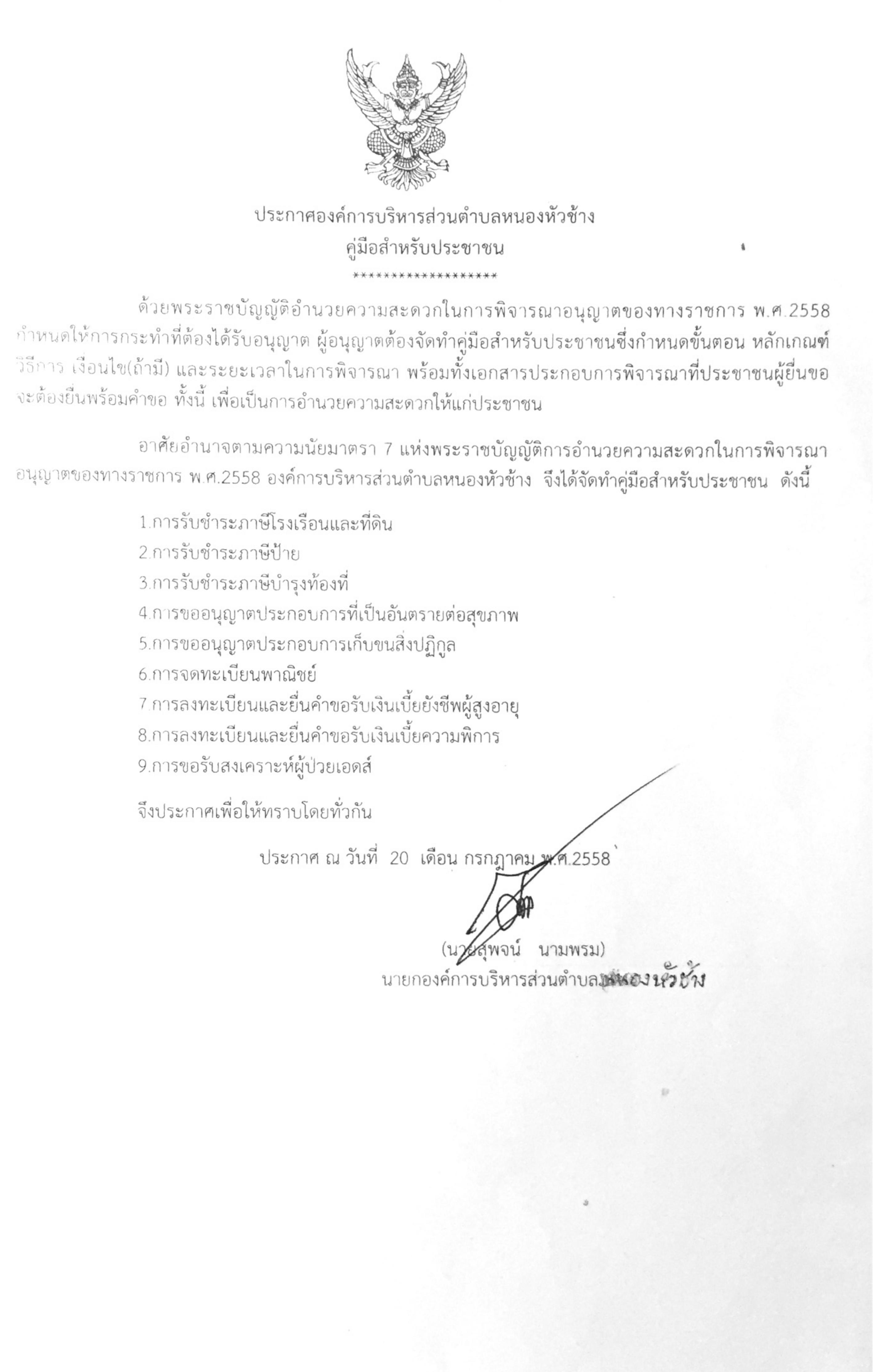 ประกาศองค์การบริหารส่วนตำบลหนองหัวช้าง เรื่อง คู่มือสำหรับประชาชน