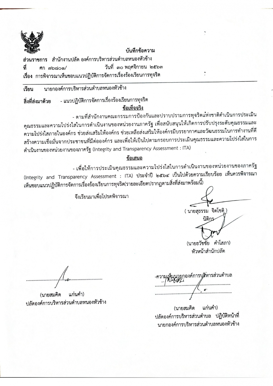 แนวปฏิบัติการจัดการเรื่องร้องเรียนการทุจริต ขององค์การบริหารส่วนตำบลหนองหัวช้าง