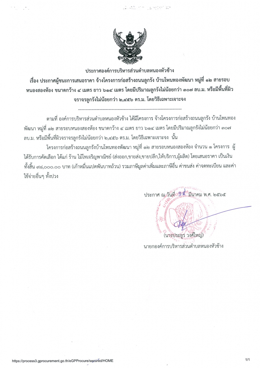 วันจันทร์, 14 มีนาคม 2565 15:20ประกาศองค์การบริหารส่วนตำบลหนองหัวช้าง เรื่อง ประกาศผู้ชนะการเสนอราคาจ้าง โครงการก่อสร้างถนนลูกรัง บ้านโพนทองพัฒนา หมู่ที่ 12 สายรอบหนองสองห้อง ขนาดกว้าง 4 เมตร ยาว 614 เมตร โดยมีปริมาณลูกรังไม่น้อยกว่า 307 ลบ.ม. หรือมีพื้นที่ผิวจราจรลูกรังไม่น้อยกว่า 2,456 ตร.ม. โดยวิธีเฉพาะเจาะจง