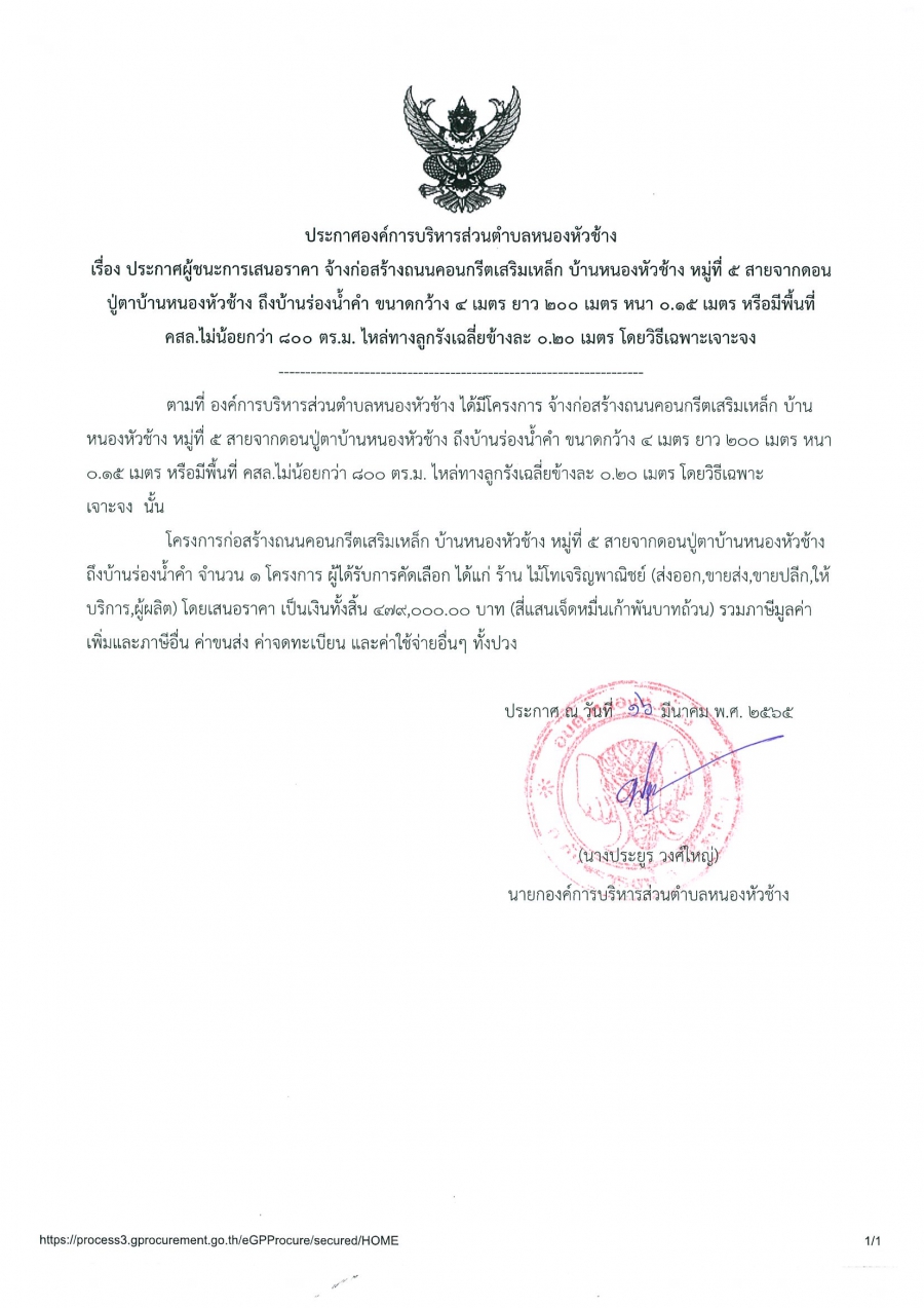 วันพุธ, 16 มีนาคม 2565 15:07ประกาศองค์การบริหารส่วนตำบลหนองหัวช้าง เรื่อง ประกาศผู้ชนะการเสนอราคา จ้างก่อสร้างถนนคอนกรีตเสริมเหล็ก บ้านหนองหัวช้าง หมู่ที่ 5 สายทางจากดอนปู่ตาบ้านหนองหัวช้าง ถึงบ้านร่องน้ำคำ ขนาดกว้าง 4 เมตร ยาว 200 เมตร หนา 0.15 เมตร หรือมีพื้นที่ คสล. ไม่น้อยกว่า 800 ตร.ม. ไหล่ทางลูกรังเฉลี่ยข้างละ 0.20 เมตร โดยวิธีเฉพาะเจาะจง