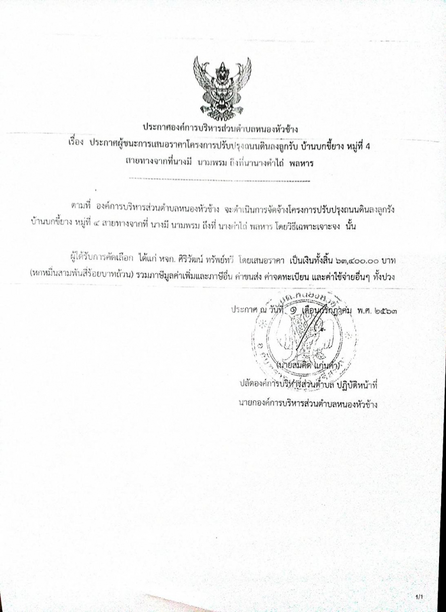 ประกาศองค์การบริหารส่วนตำบลหนองหัวช้าง เรื่องประกาศผู้ชนะการจัเสนอราคาโครงการปรับปรุงถนนดินลงลูกรัง บ้านทุ่งพาย หมู่ที่ 4