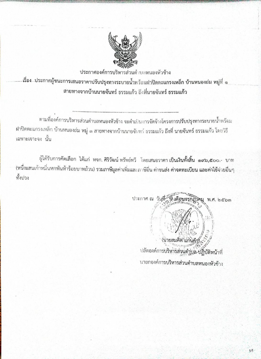 ประกาศองค์การบริหารส่วนตำบลหนองหัวช้าง เรื่องประกาศผู้ชนะการเสนอราคาปรับปรุงทางระบายน้ำพร้อมฝาปิดตะแกรงเหล็ก บ้านหนองถ่ม หมู่ที่ 1