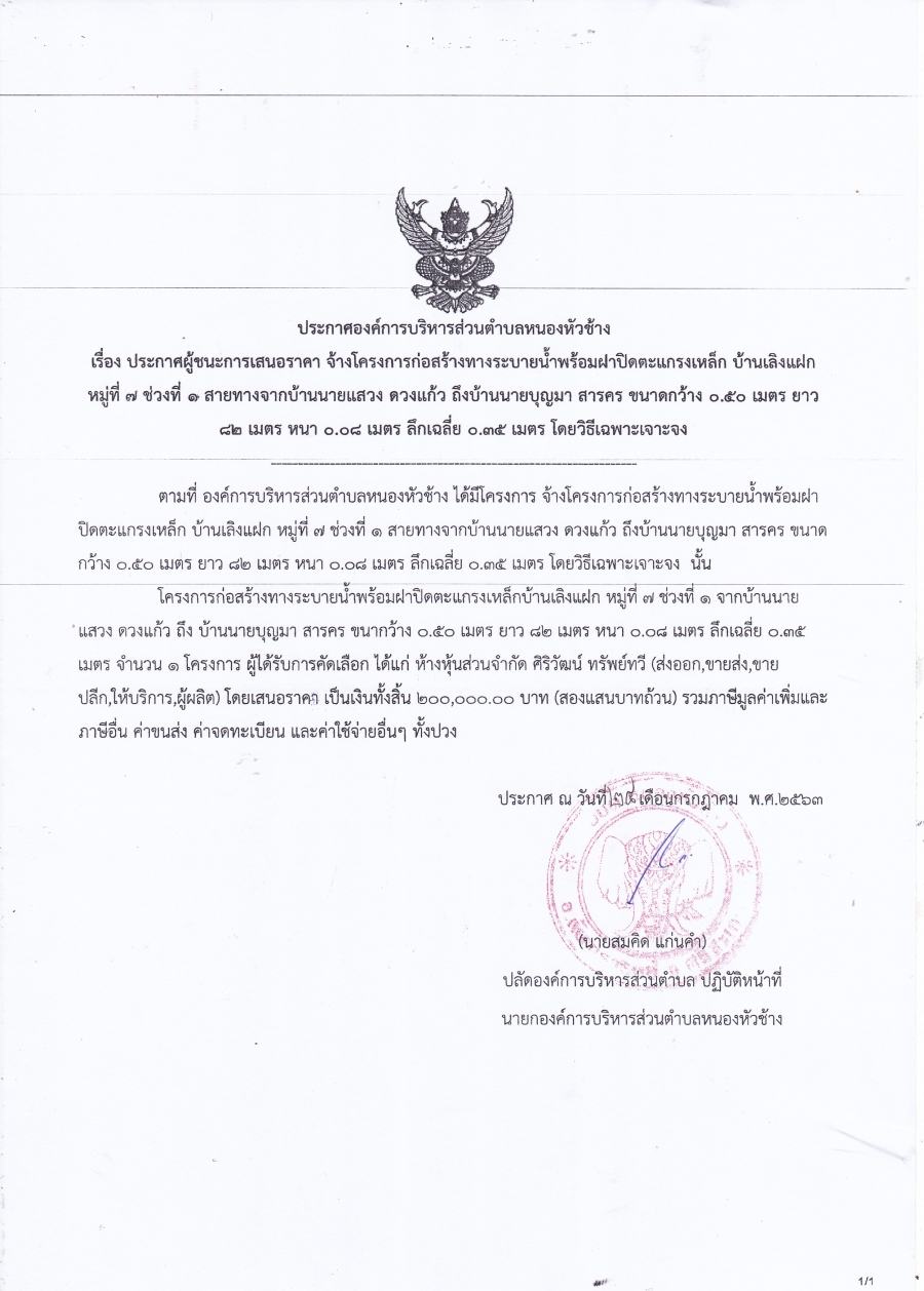 ประกาศองค์การบริหารส่วนตำบลหนองหัวช้าง เรื่อง ประกาศผู้ชนะการเสนอราคาจ้างโครงการก่อสร้างทางระบายน้ำพร้อมฝาปิดตะแกรงเหล็ก บ้านเลิงแฝก หมู่ที่ 7 สายทางจากบ้านนายแสวง ดวงแก้ว ถึงบ้านนายบุญมา สารคร