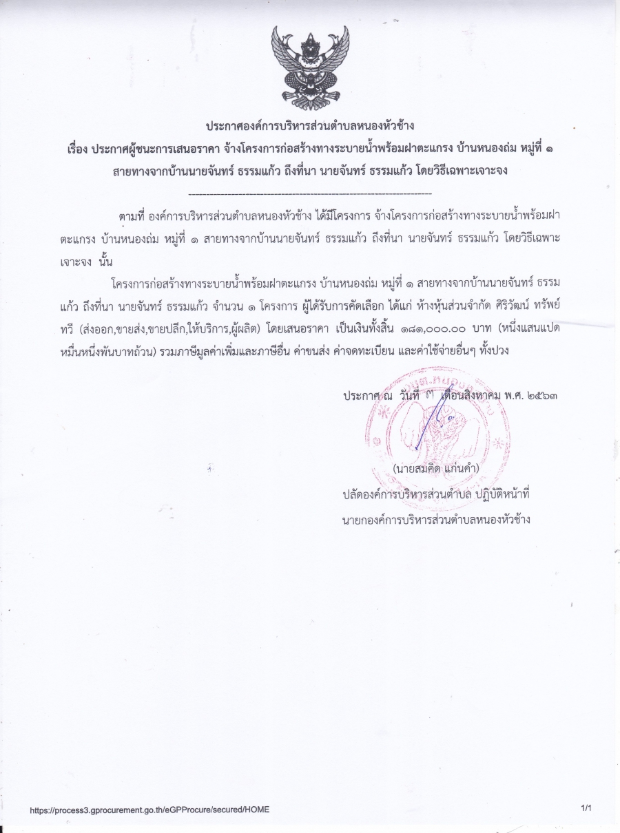 ประกาศองค์การบริหารส่วนตำบลหนองหัวช้าง เรื่อง ประกาศผู้ชนะการเสนอราคาจ้างโครงการก่อสรา้งทางระบายน้ำพร้อมฝาตะแกรง บ้านหนองถ่ม หมู่ที่ 1