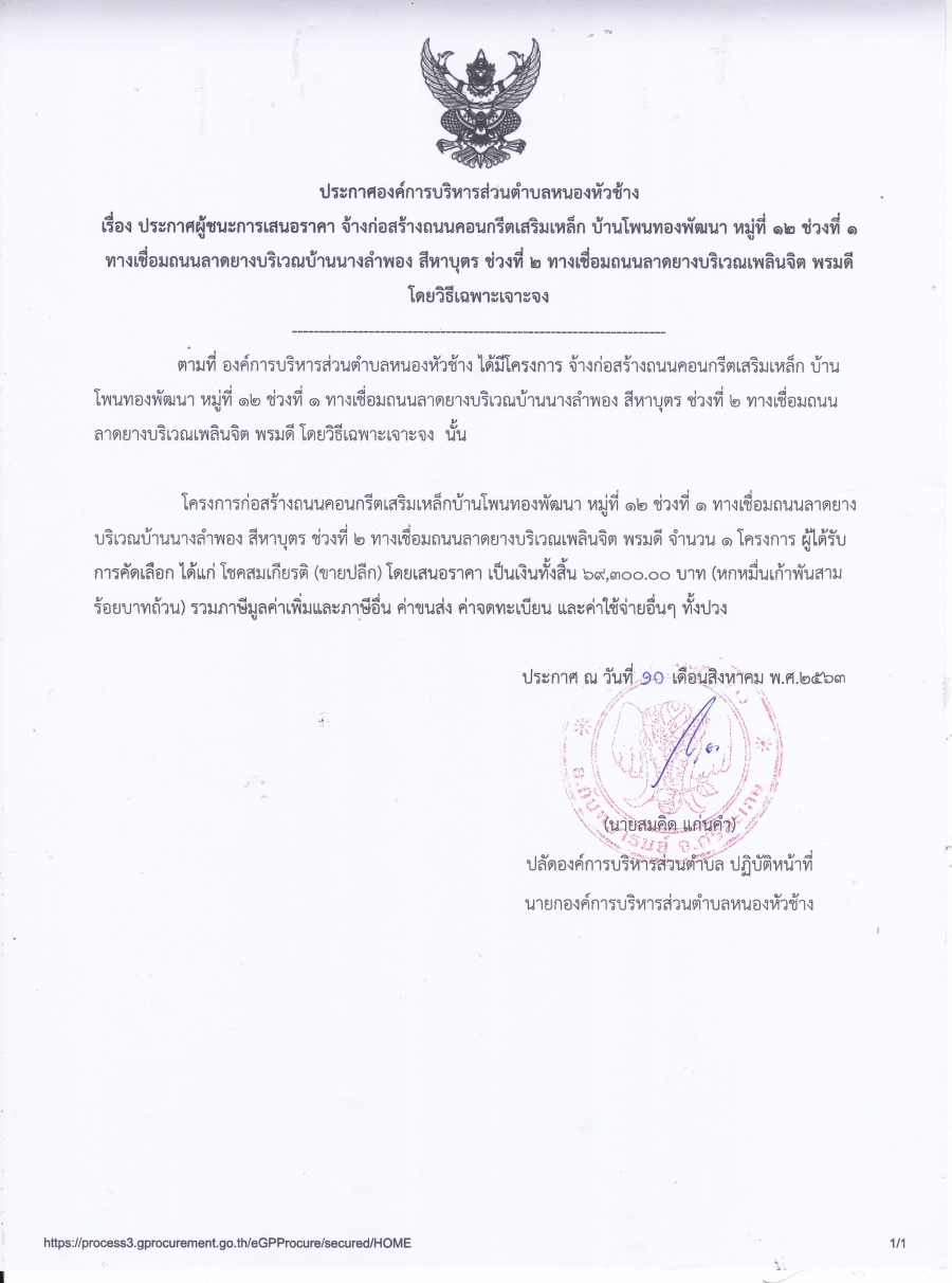 ประกาศองค์การบริหารส่วนตำบลหนองหัวช้าง เรื่อง ประกาศผู้ชนะการเสนอราคาจ้างก่อสร้างถนนคอนกรีตเสริมเหล็ก บ้านโพนทองพัฒนา หมู่ที่ 12
