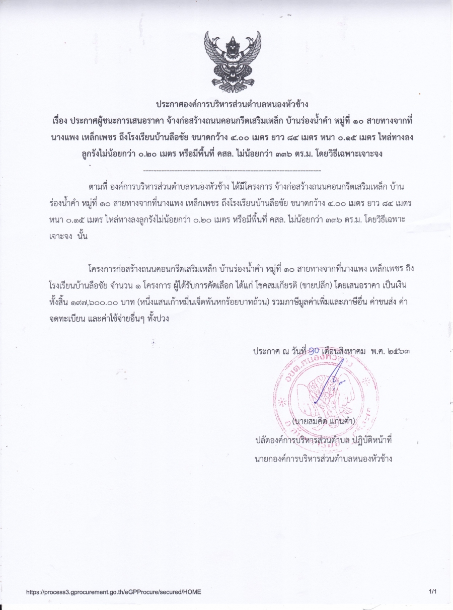 ประกาศองค์การบริหารส่วนตำบลหนองหัวช้าง เรื่อง ประกาศผู้ชนะการเสนอราคาจ้างก่อสร้างถนนคอนกรีตเสริมเหล็ก บ้านร่องน้ำคำ หมู่ที่ 10