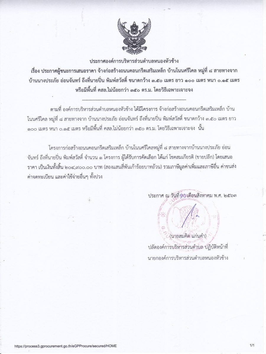 ประกาศองค์การบริหารส่วนตำบลหนองหัวช้าง เรื่อง ประกาศผู้ชนะการเสนอราคาจ้างก่อสร้างถนนคอนกรีตเสริมเหล็ก บ้านโนนศรีไคล หมู่ที่ 8
