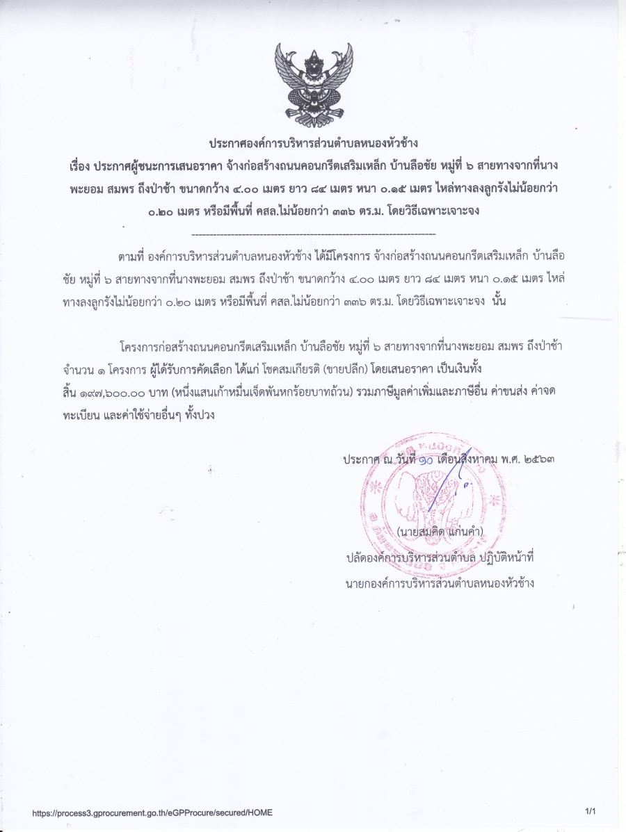 ประกาศองค์การบริหารส่วนตำบลหนองหัวช้าง เรื่อง ประกาศผู้ชนะการเสนอราคาจ้างก่อสร้างถนนคอนกรีตเสริมเหล็ก บ้านลือชัย หมู่ที่ 6
