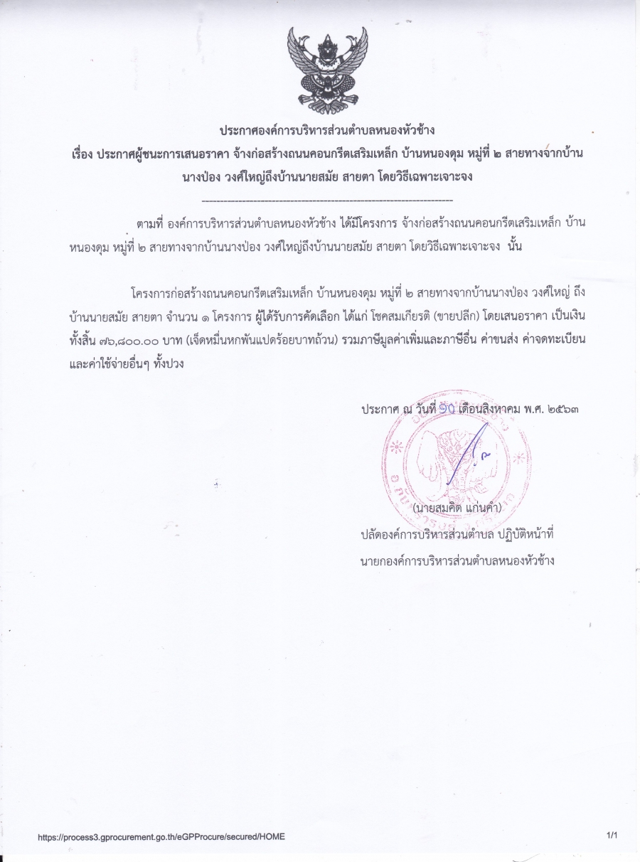 ประกาศองค์การบริหารส่วนตำบลหนองหัวช้าง เรื่อง ประกาศผู้ชนะการเสนอราคาจ้างก่อสร้างถนนคอนกรีตเสริมเหล็ก บ้านหนองดุม หมู่ที่ 2
