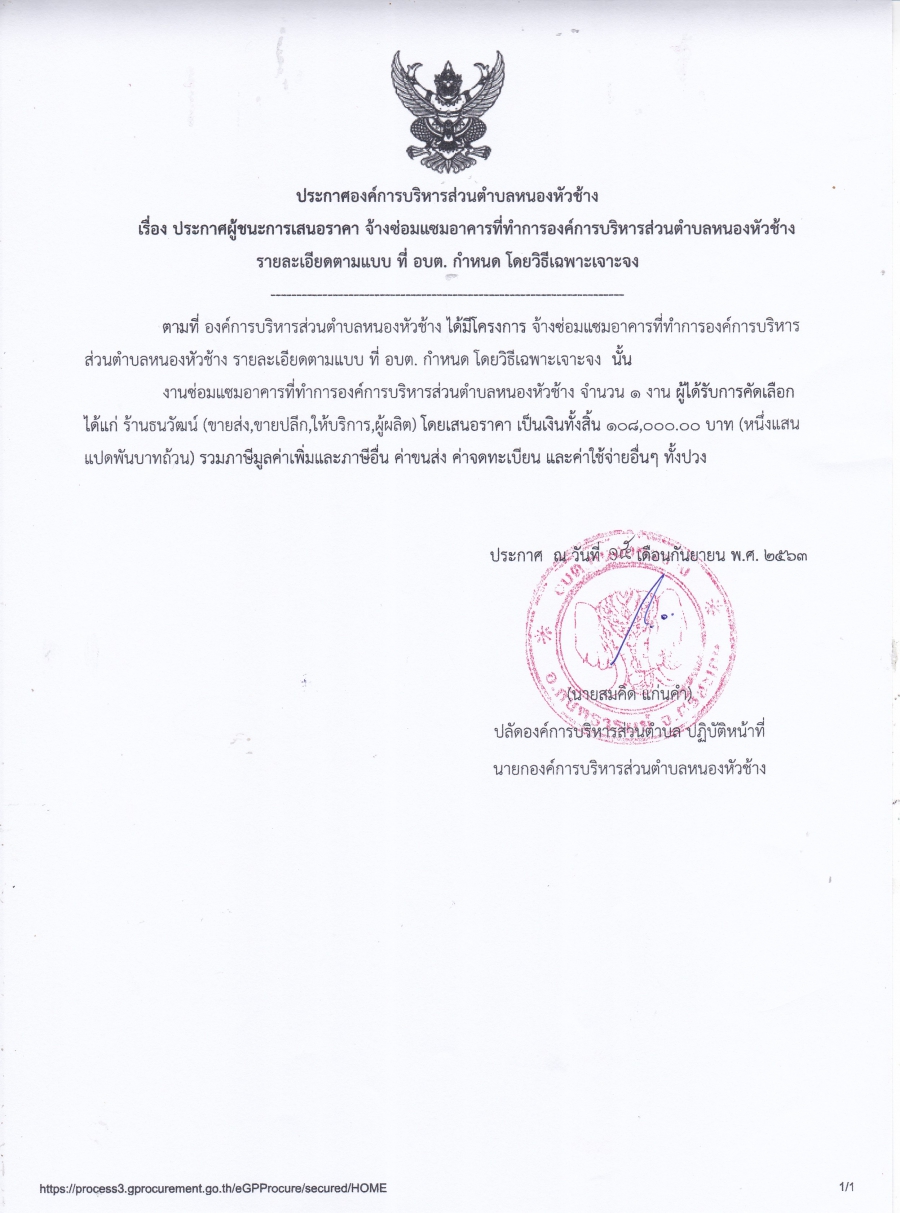 ประกาศองค์การบริหารส่วนตำบลหนองหัวช้าง เรื่อง ประกาศผู้ชนะการเสนอราคา จ้างซ่อมแซมอาคารที่ทำการองค์การบริหารส่วนตำบลหนองหัวช้าง รายละเอียดตามแบบที่ อบต. กำหนด โดยวิธีเฉพาะเจาะจง