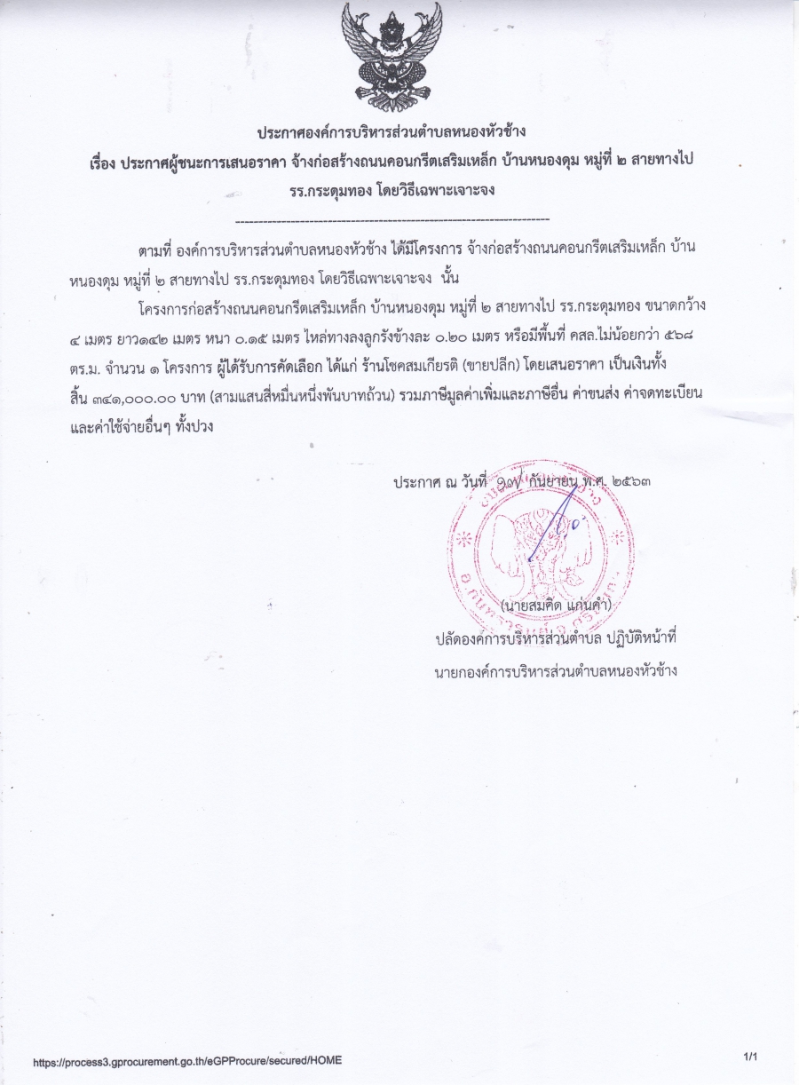 ประกาศองค์การบริหารส่วนตำบลหนองหัวช้าง เรื่อง ประกาศผู้ชนะการเสนอราคา จ้างก่อสร้างถนนคอนกรีตเสริมเหล็ก บ้านหนองดุม หมู่ที่ 2 สายทางไปโรงเรียนกระดุมทองวิทยา โดยวิธีเฉพาะเจาะจง