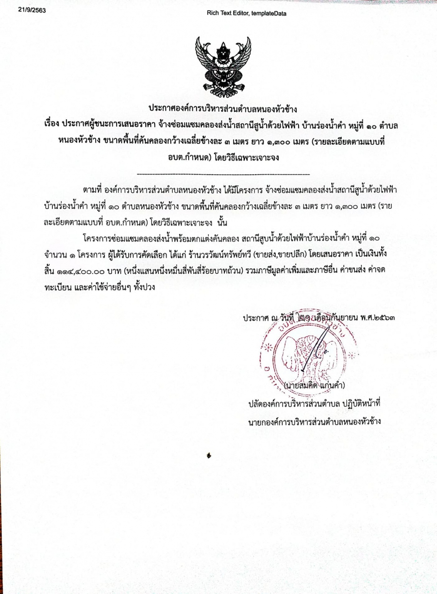 วันจันทร์, 21 กันยายน 2563 15:43ประกาศองค์การบริหารส่วนตำบลหนองหัวช้าง เรื่อง ประกาศผู้ชนะการเสนอราคา จ้างซ่อมแซมคลองส่งน้ำสถานีสูบน้ำด้วยไฟฟ้า บ้านร่องน้ำคำ หมู่ที่ 10 ตำบลหนองหัวช้าง ขนาดพื้นที่คันคลอง กว้างเฉลี่ยข้างละ 3 เมตร ยาว 1,300 เมตร (รายละเอียดตามแบบที่ อบต. กำหนด) โดยวิธีเฉพาะเจาะจง