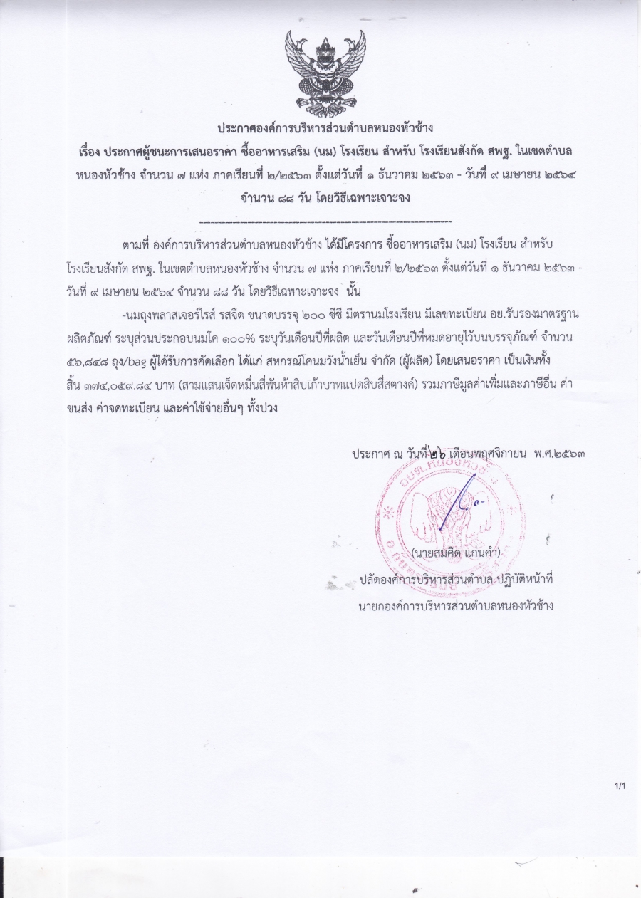 ประกาศองค์การบริหารส่วนตำบลหนองหัวช้าง เรื่อง ประกาศผู้ชนะการเสนอราคา ซื้ออาหารเสริม (นม) โรงเรียน สำหรับโรงเรียนสังกัด สพฐ. ในเขตตำบลหนองหัวช้าง