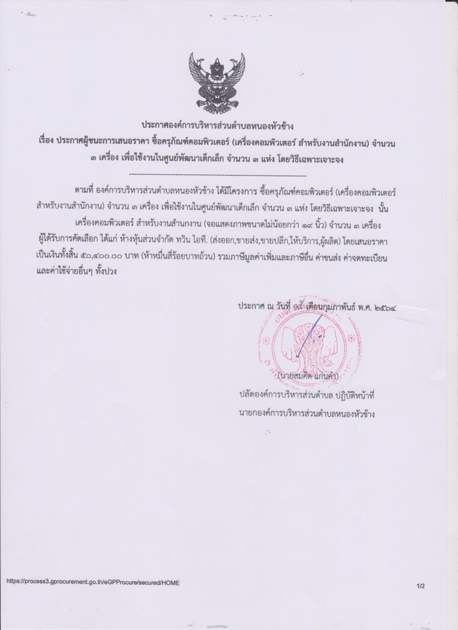 ประกาศองค์การบริหารส่วนตำบลหนองหัวช้าง เรื่อง ประกาศผู้ชนะการเสนอราคาซื้อครุภัณฑ์อมพิวเตอร์ (เครื่องคอมพิวเตอร์ สำหรับงานสำนักงาน) จำนวน 3 เครื่อง เพื่อใช้งานในศูนย์พัฒนาเด็กเล็ก จำนวน 3 แห่ง โดยวิธีเฉพาะเจาะจง