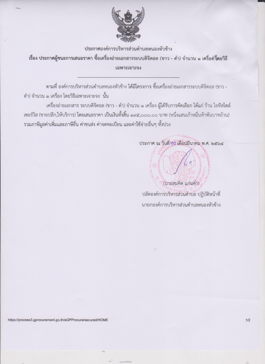 ประกาศองค์การบริหารส่วนตำบลหนองหัวช้าง เรื่อง ประกาศผู้ชนะการเสนอราคา ซื้อเครื่องถ่ายเอกสารระบบดิจิตอล (ขาว-ดำ) จำนวน 1 เครื่อง โดยวิธีเฉพาะเจาะจง