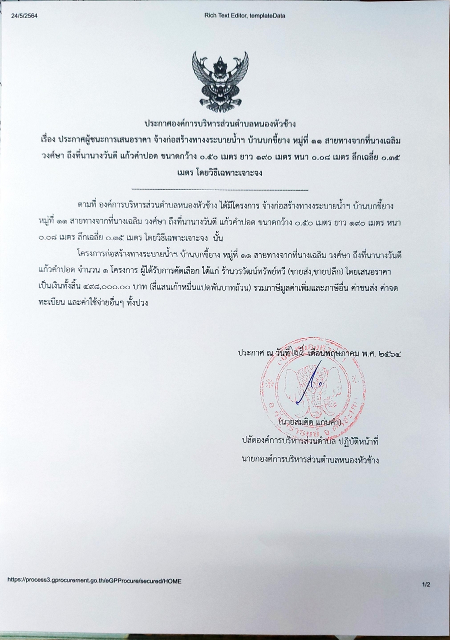 ประกาศองค์การบริหารส่วนตำบลหนองหัวช้าง เรื่อง ประกาศผู้ชนะการเสนอราคา จ้างก่อสร้างทางระบายน้ำฯ บ้านบกขี้ยาง หมู่ที่ 11สายทางจากที่นางเฉลิม วงศ์ษา ถึงที่นานางวันดี แก้วคำปอด