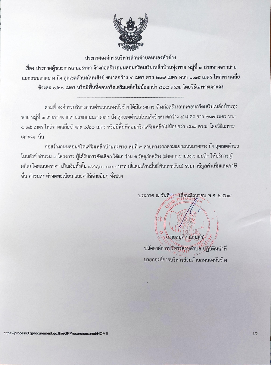 ประกาศองค์การบริหารส่วนตำบลหนองหัวช้าง เรื่อง จ้างก่อสร้างถนนคอนกรีตเสริมเหล็กบ้านทุ่งพาย หมู่ที่ 3 สายทางจากสามแยกถนนลาดยาง ถึง สุดเขตตำบลโนนสังข์