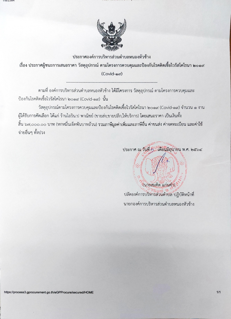 ประกาศองค์การบริหารส่วนตำบลหนองหัวช้าง เรื่อง ประกาศผู้ชนะการเสนอราคา วัสดุอุปกรณ์ ตามโครงการควบคุมและป้องกันโรคติดเชื้อไวรัสโคโรนา 2019