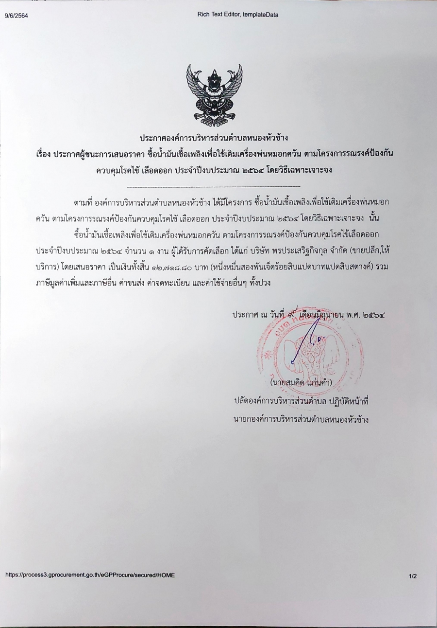 วันพุธ, 09 มิถุนายน 2564 15:26ประกาศองค์การบริหารส่วนตำบลหนองหัวช้าง เรื่อง ประกาศผู้ชนะการเสนอราคา ซื้อน้ำมันเชื้อเพลิงเพื่อใช้เติมเครื่องพ่นหมอกควัน ตามโครงการรณรงค์ป้องกันควบคุมโรคไข้เลือดออก ประจำปีงบประมาณ 2564 โดยวิธีเฉพาะเจาะจง