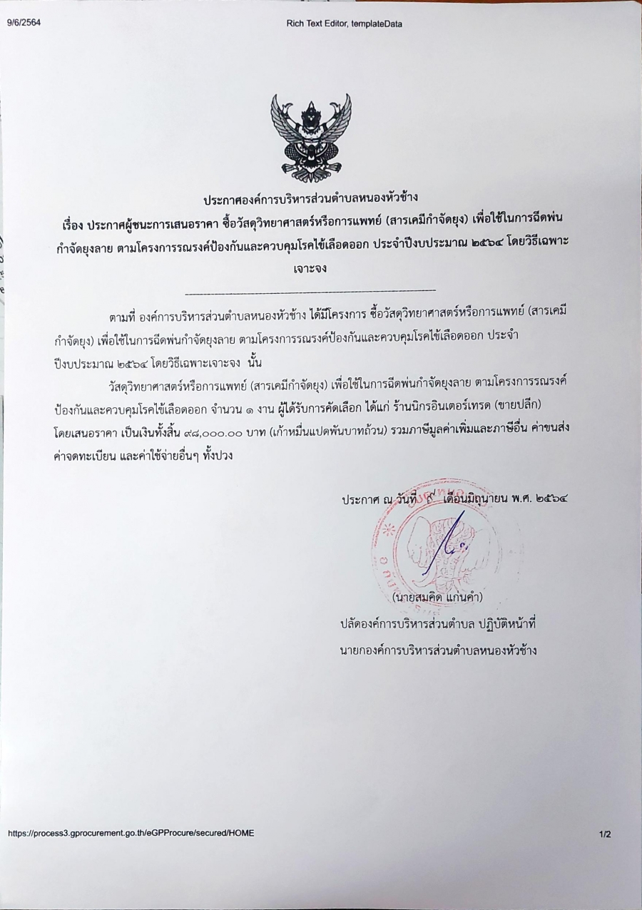 ประกาศองค์การบริหารส่วนตำบลหนองหัวช้าง เรื่อง ประกาศผู้ชนะการเสนอราคา ซื้อวัสดุวิทยาศาสตร์หรือการแพทย์ (สารเคมีกำจัดยุง) เพื่อใช้ในการฉีดพ่นกำจัดยุงลาย ตามโครงการรณรงค์ป้องกันและควบคุมโรคไข้เลือดออก ประจำปีงบประมาณ 2564 โดยวิธีเฉพาะเจาะจง