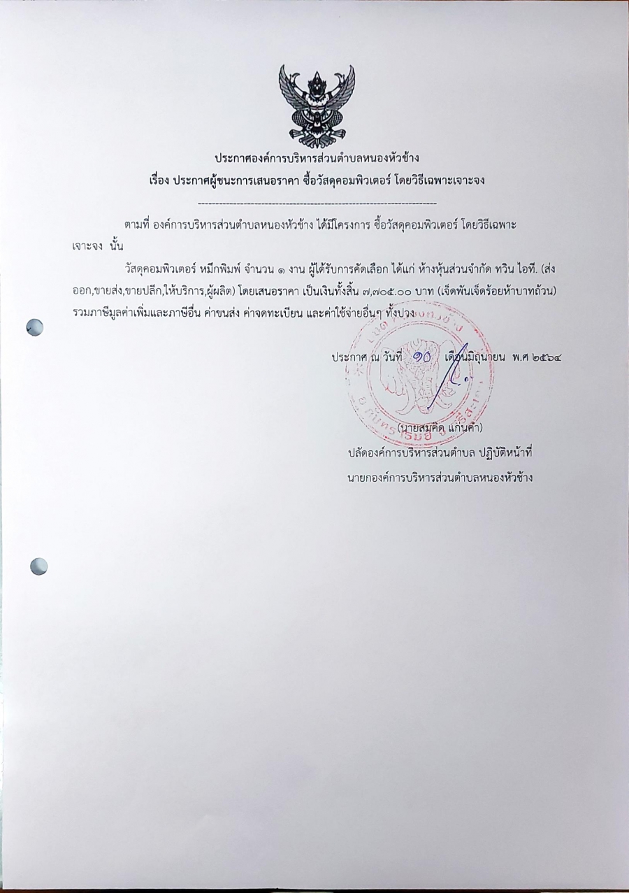 ประกาศองค์การบริหารส่วนตำบลหนองหัวช้าง เรื่อง ประกาศผู้ชนะการเสนอราคา ซื้อวัสดุคอมพิวเตอร์ โดยวิธีเฉพาะเจาะจง