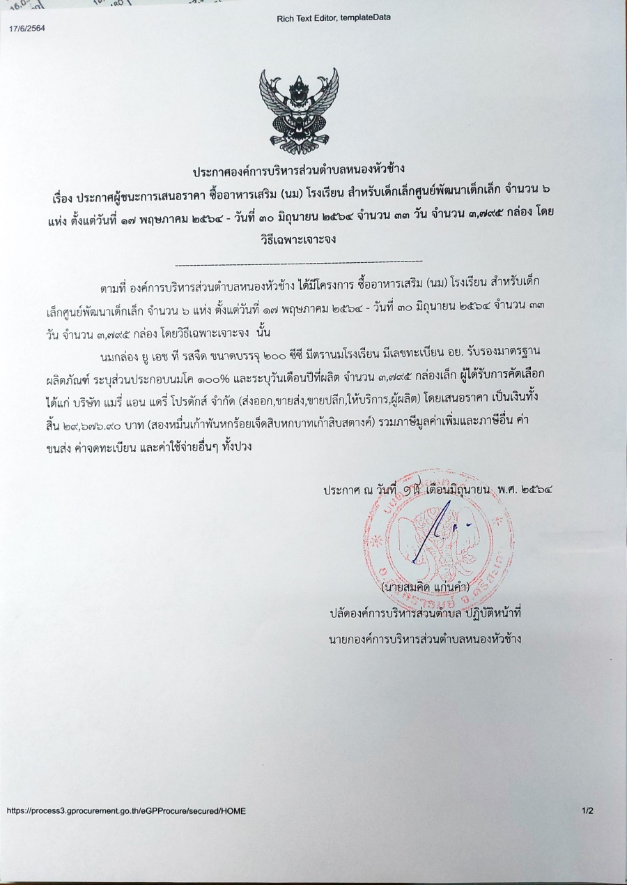 ประกาศองค์การบริหารส่วนตำบลหนองหัวช้าง เรื่อง ประกาศผู้ชนะการเสนอราคา ซื้ออาหารเสริม (นม) โรงเรียน สำหรับศูนย์พัฒนาเด็กเล็ก จำนวน 6 แห่ง
