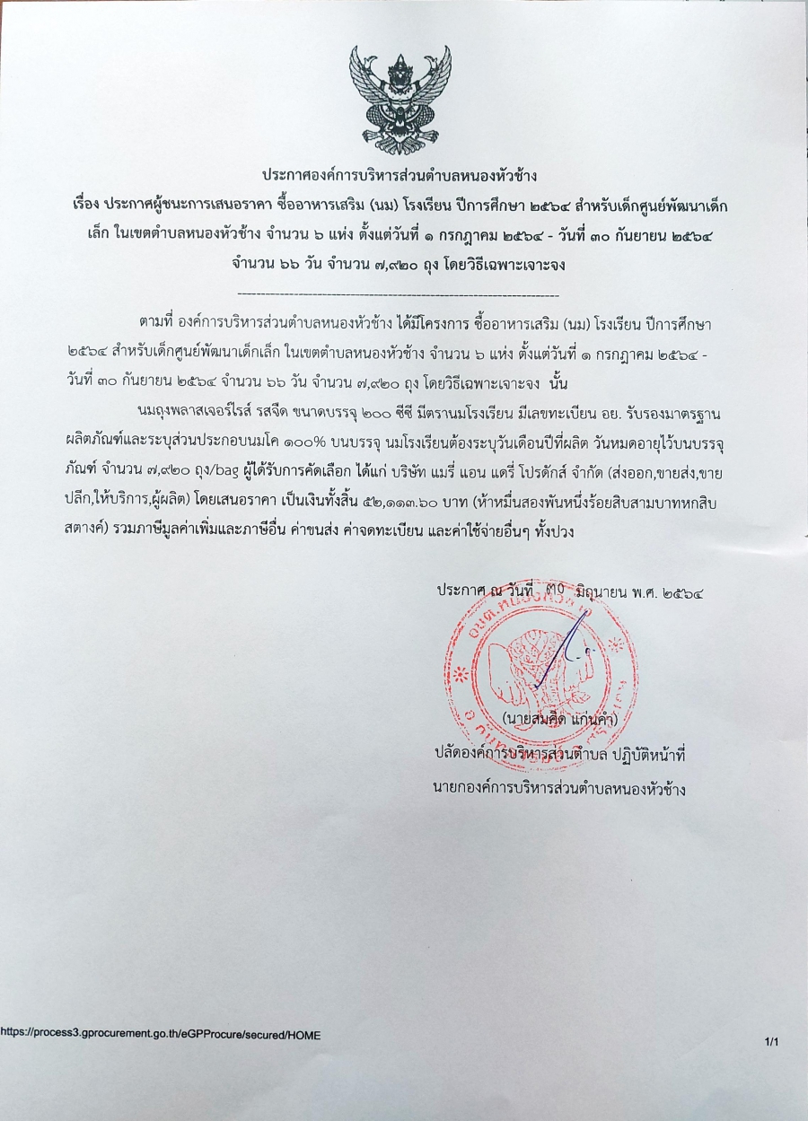 ประกาศองค์การบริหารส่วนตำบลหนองหัวช้าง เรื่อง ประกาศผู้ชนะการเสนอราคา ซื้ออาหารเสริม (นม) โรงเรียน ปีการศึกษา 2564 สำหรับเด็กศูนย์พัฒนาเด็กเล็ก ในเขตตำบลหนองหัวช้าง จำนวน 6 แห่ง