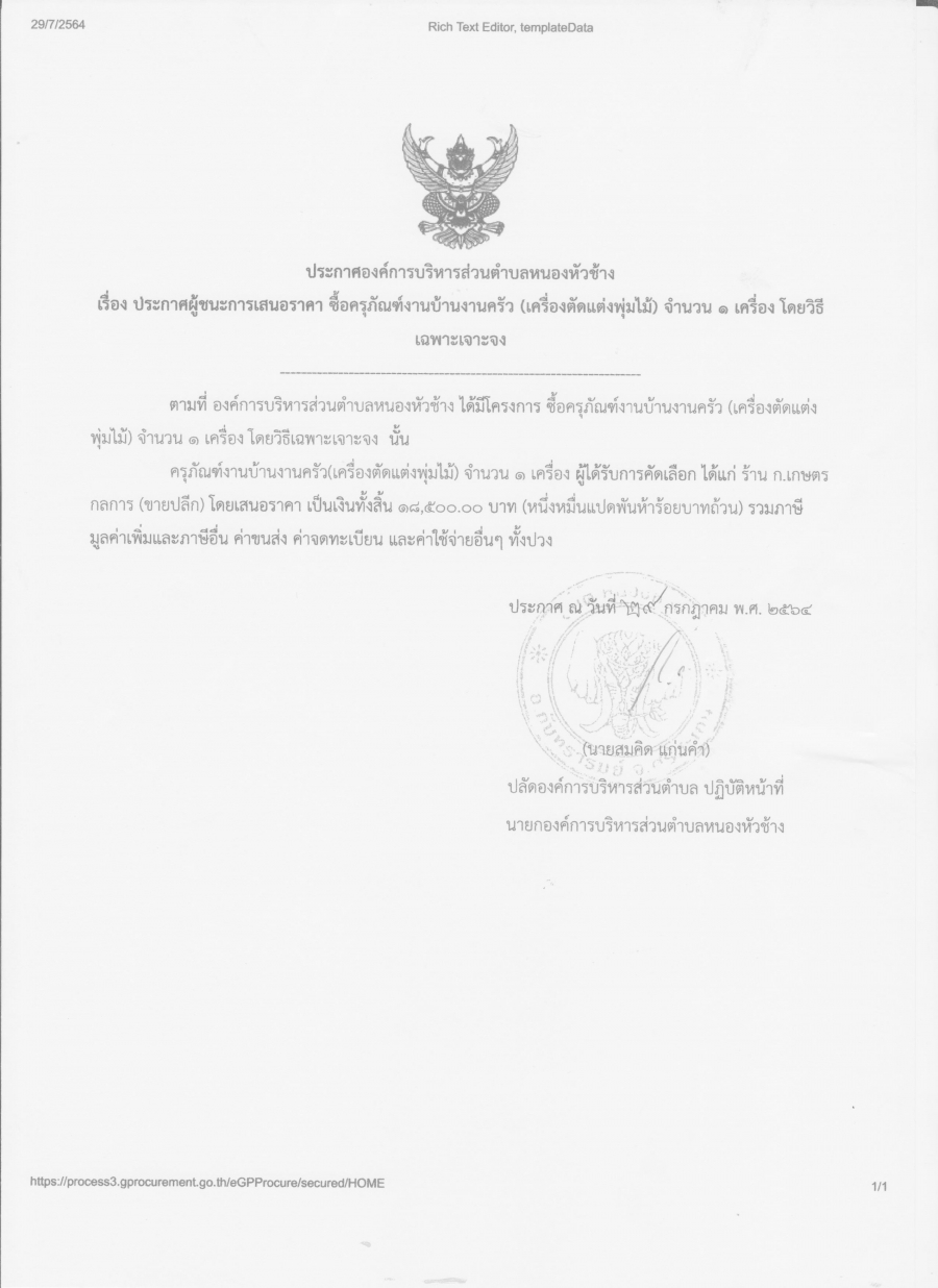 ประกาศองค์การบริหารส่วนตำบลหนองหัวช้าง เรื่อง ประกาศผู้ชนะการเสนอราคา ซื้อครุภัณฑ์งานบ้านงานครัว (เครื่องตัดแต่งพุ่มไม้) จำนวน 1 เครื่อง โดยวิธีเฉพาะเจาะจง