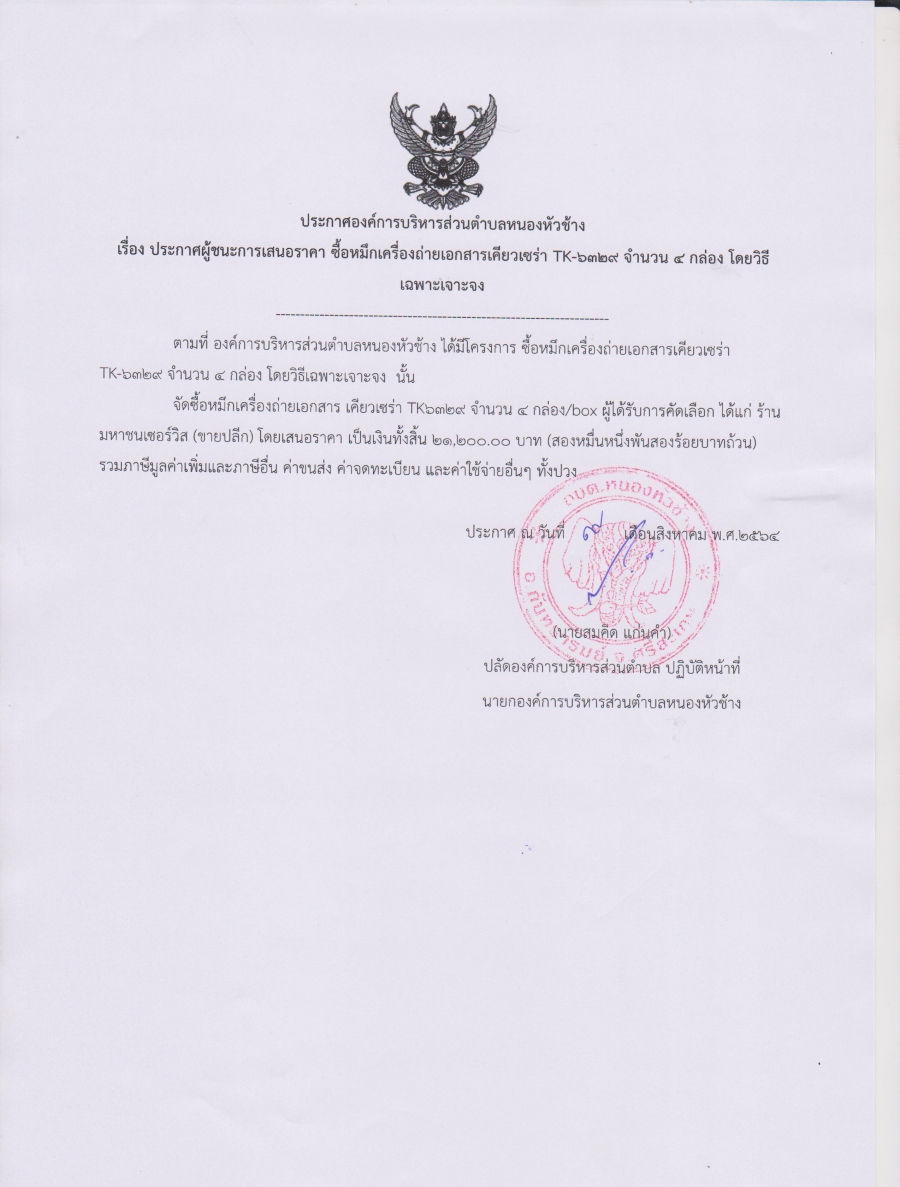 ประกาศองค์การบริหารส่วนตำบลหนองหัวช้าง เรื่องประกาศผู้ชนะการเสนอราคา ซื้อหมึกเครื่องถ่ายเอกสารเคียวเซร่า TK-6329 จำนวน 4 กล่อง โดยวิธีเฉพาะเจาะจง