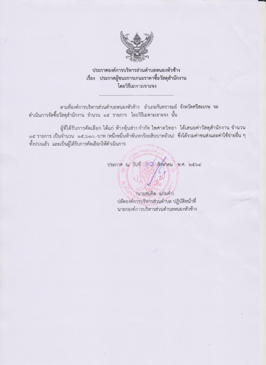 ประกาศองค์การบริหารส่วนตำบลหนองหัวช้าง เรื่องประกาศผู้ชนะการเสนอราคา ซื้อวัสดุสำนักงาน โดยวิธีเฉพาะเจาะจง