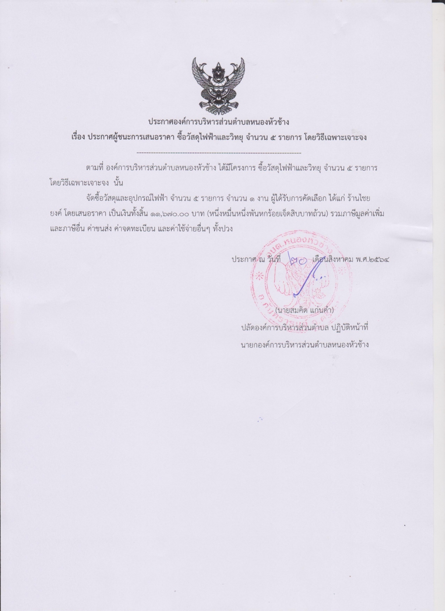 ประกาศองค์การบริหารส่วนตำบลหนองหัวช้าง เรื่องประกาศผู้ชนะการเสนอราคา ซื้อวัสดุไฟฟ้าและวิทยุ จำนวน 5 รายการ โดยวิธีเฉพาะเจาะจง
