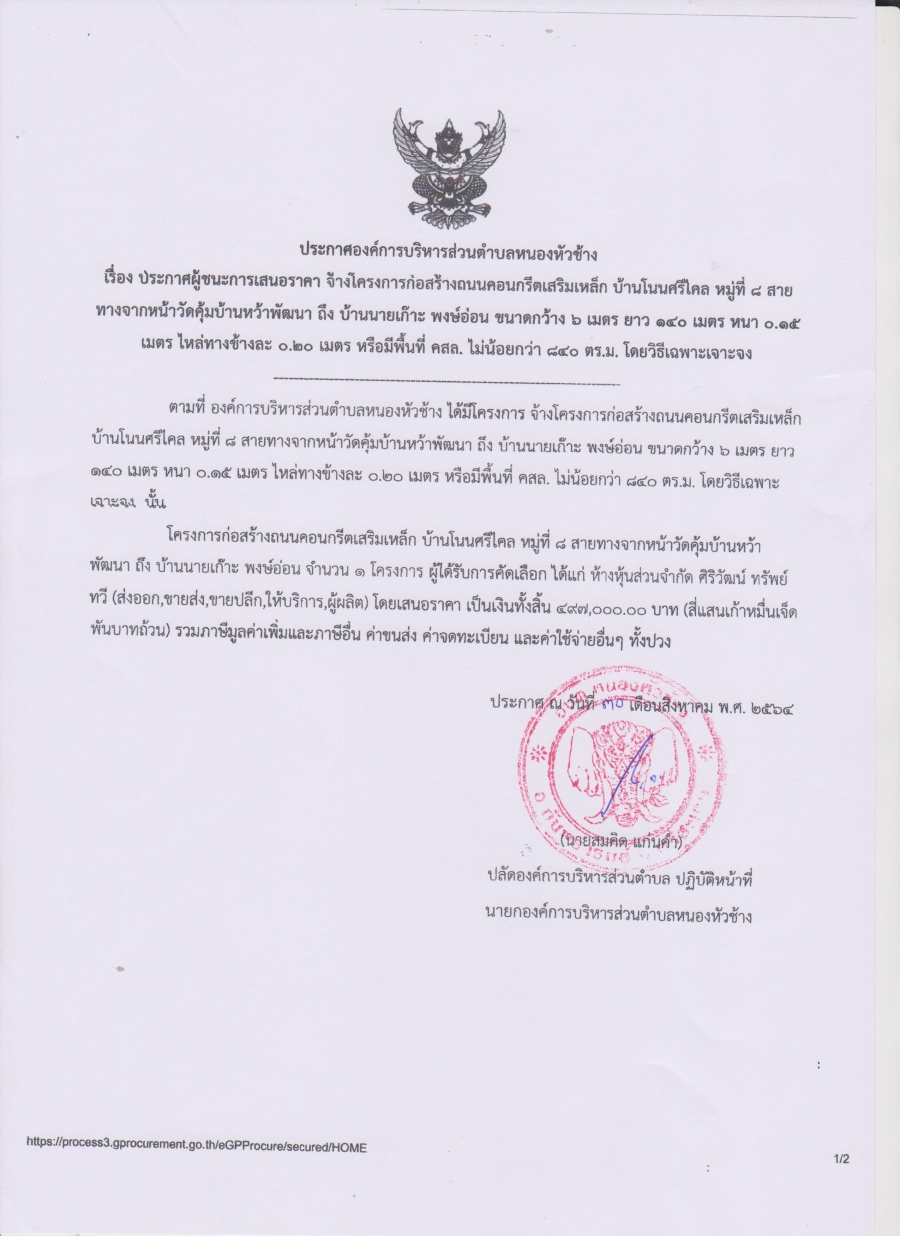 ประกาศองค์การบริหารส่วนตำบลหนองหัวช้าง เรื่องประกาศผู้ชนะการเสนอราคาจ้าง โครงการก่อสรา้งถนนคอนกรีตเสริมเหล็กเสริมเหล็ก บ้านโนนศรีไคล หมู่ที่ 8 สายทางจากหน้าวัดคุ้มบ้านหว้าพัฒนา ถึง บ้านนายเก๊าะ พงษ์อ่อน โดยวิธีเฉพาะเจาะจง