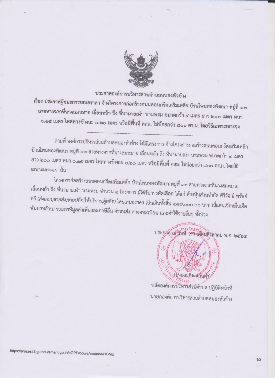 ประกาศองค์การบริหารส่วนตำบลหนองหัวช้าง เรื่องประกาศผู้ชนะการเสนอราคาจ้าง โครงการก่อสร้างถนนคอนกรีตเสริมเหล็กเสริมเหล็ก บ้านโพนทองพัฒนา หมู่ที่ 12 สายทางจากที่นางสมหมาย เถื่อนหล้า ถึง ที่นานายสง่า นามพรม โดยวิธีเฉพาะเจาะจง