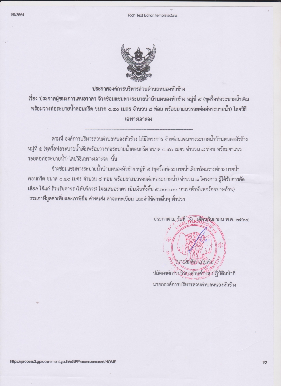 ประกาศองค์การบริหารส่วนตำบลหนองหัวช้าง เรื่องประกาศผู้ชนะการเสนอราคาจ้าง ซ่อมแซมทางระบายน้ำบ้านหนองหัวช้าง หมู่ที่ 5 โดยวิธีเฉพาะเจาะจง