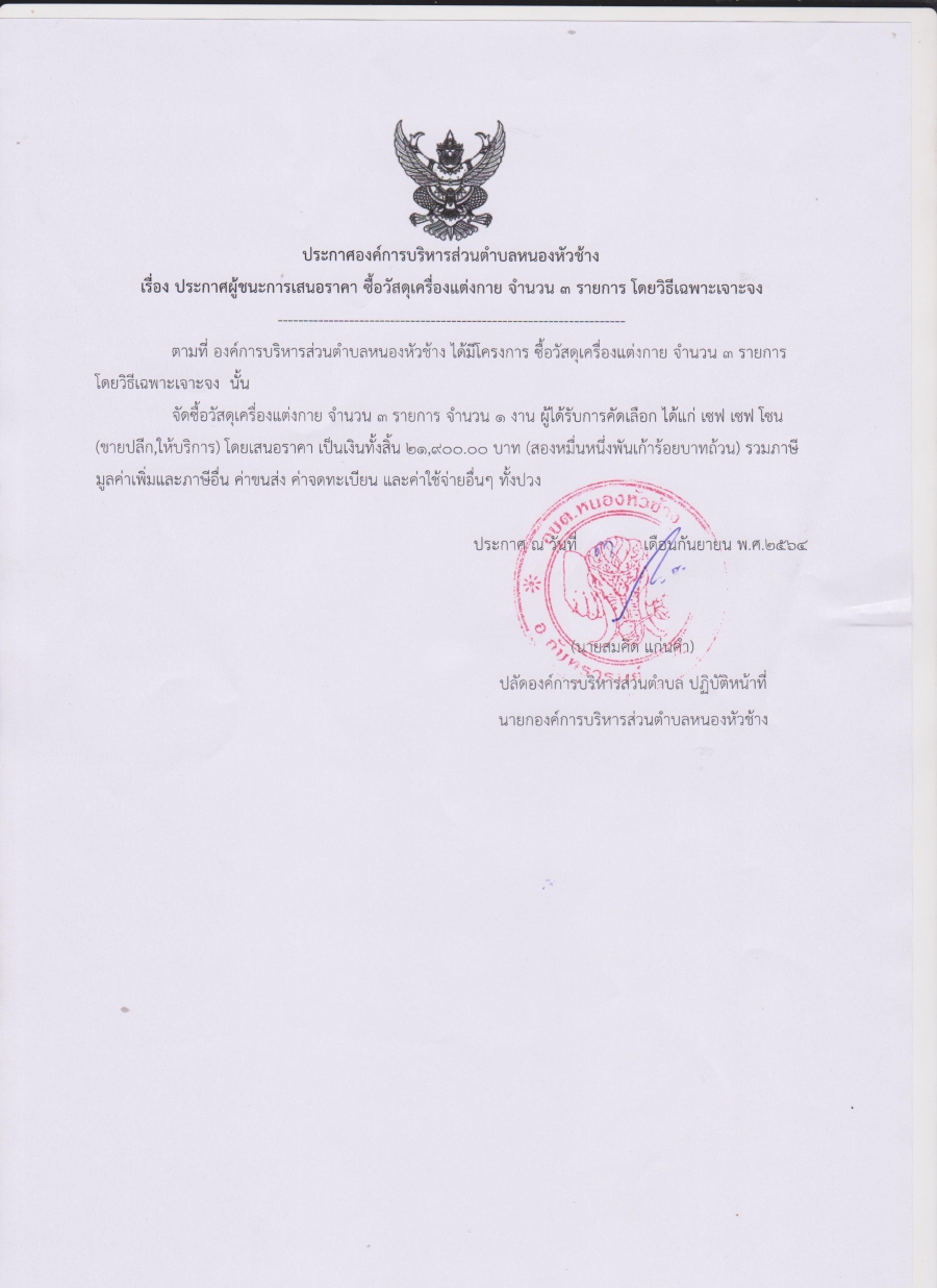 ประกาศองค์การบริหารส่วนตำบลหนองหัวช้าง เรื่องประกาศผู้ชนะการเสนอราคา ซื้อวัสดุเครื่องแต่งกายจำนวน 3 รายการ โดยวิธีเฉพาะเจาะจง