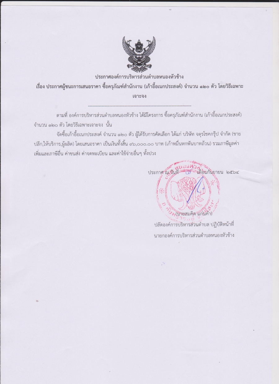 ประกาศองค์การบริหารส่วนตำบลหนองหัวช้าง เรื่องประกาศผู้ชนะการเสนอราคา ซื้อครุภัณฑ์สำนักงาน (เก้าอี้อเนกประสงค์) จำนวน 120 ตัว โดยวิธีเฉพาะเจาะจง