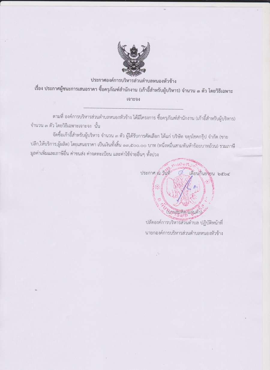 ประกาศองค์การบริหารส่วนตำบลหนองหัวช้าง เรื่องประกาศผู้ชนะการเสนอราคา ซื้อครุภัณฑ์สำนักงาน (เก้าอี้สำหรับผู้บริหาร) จำนวน 3 ตัว โดยวิธีเฉพาะเจาะจง