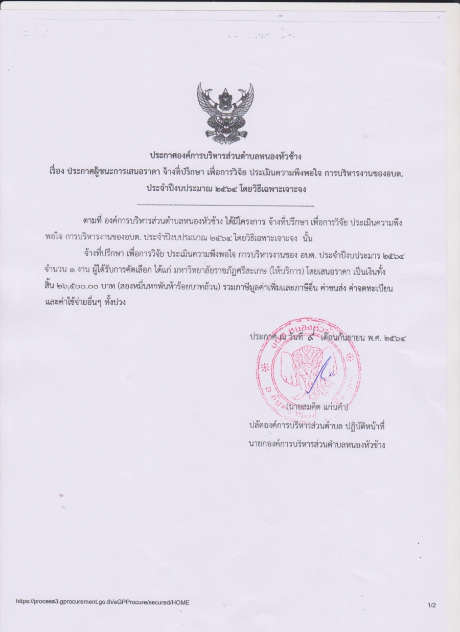 ประกาศองค์การบริหารส่วนตำบลหนองหัวช้าง เรื่องประกาศผู้ชนะการเสนอราคา จ้างที่ปรึกษา เพื่อการวิจัย ประเมินความพึงพอใจ การบริหารงานของ อบต. ประจำปีงบประมาณ 2564 โดยวิธีเฉพาะเจาะจง
