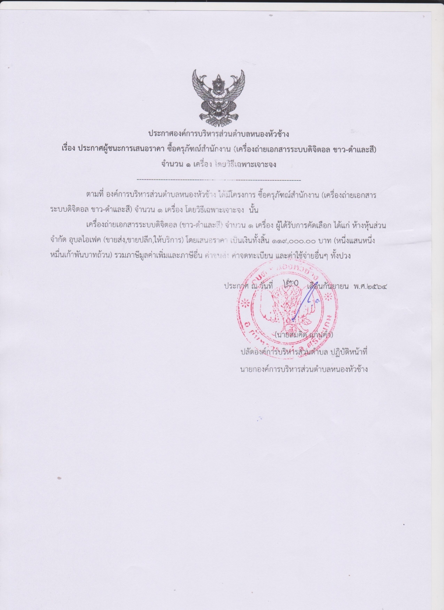 ประกาศองค์การบริหารส่วนตำบลหนองหั2วช้าง เรื่องประกาศผู้ชนะการเสนอราคา ซื้อครุภัณฑ์สำนักงาน (เครื่องถ่ายเอกสารระบบติจิตอล ขาว-ดำและสี) จำนวน 1 เครื่อง โดยวิธีเฉพาะเจาะจง