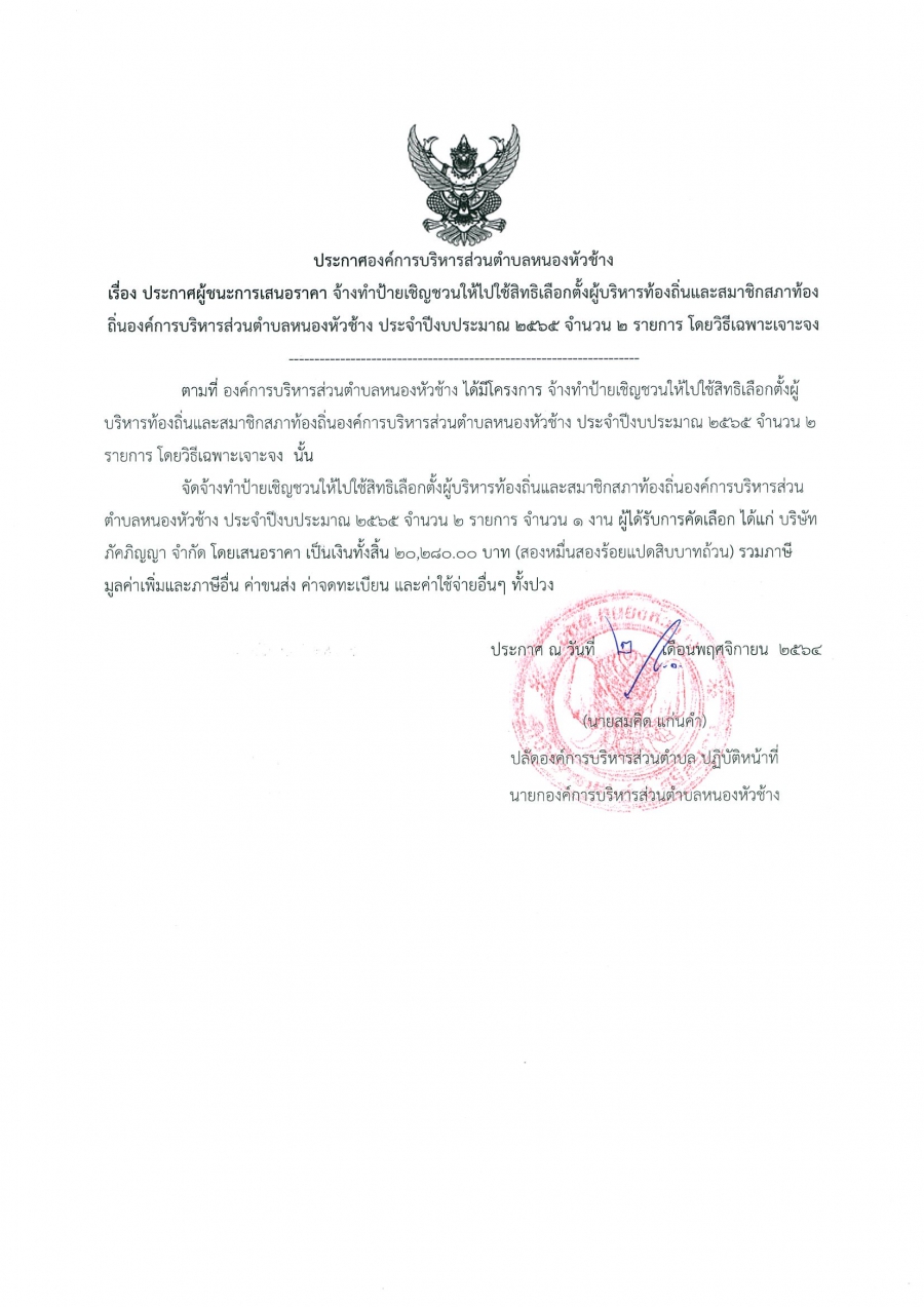 ประกาศองค์การบริหารส่วนตำบลหนองหัวช้าง เรื่องประกาศผู้ชนะการเสนอราคา จ้างทำป้ายเชิญชวนให้ไปใช้สิทธิเลือกตั้งผู้บริหารท้องถิ่นและสมาชิกสภาท้องถิ่น อบต. หนองหัวช้าง ประจำปีงบประมาณ 2565 จำนวน 2 รายการ โดยวิธีเฉพาะเจาะจง
